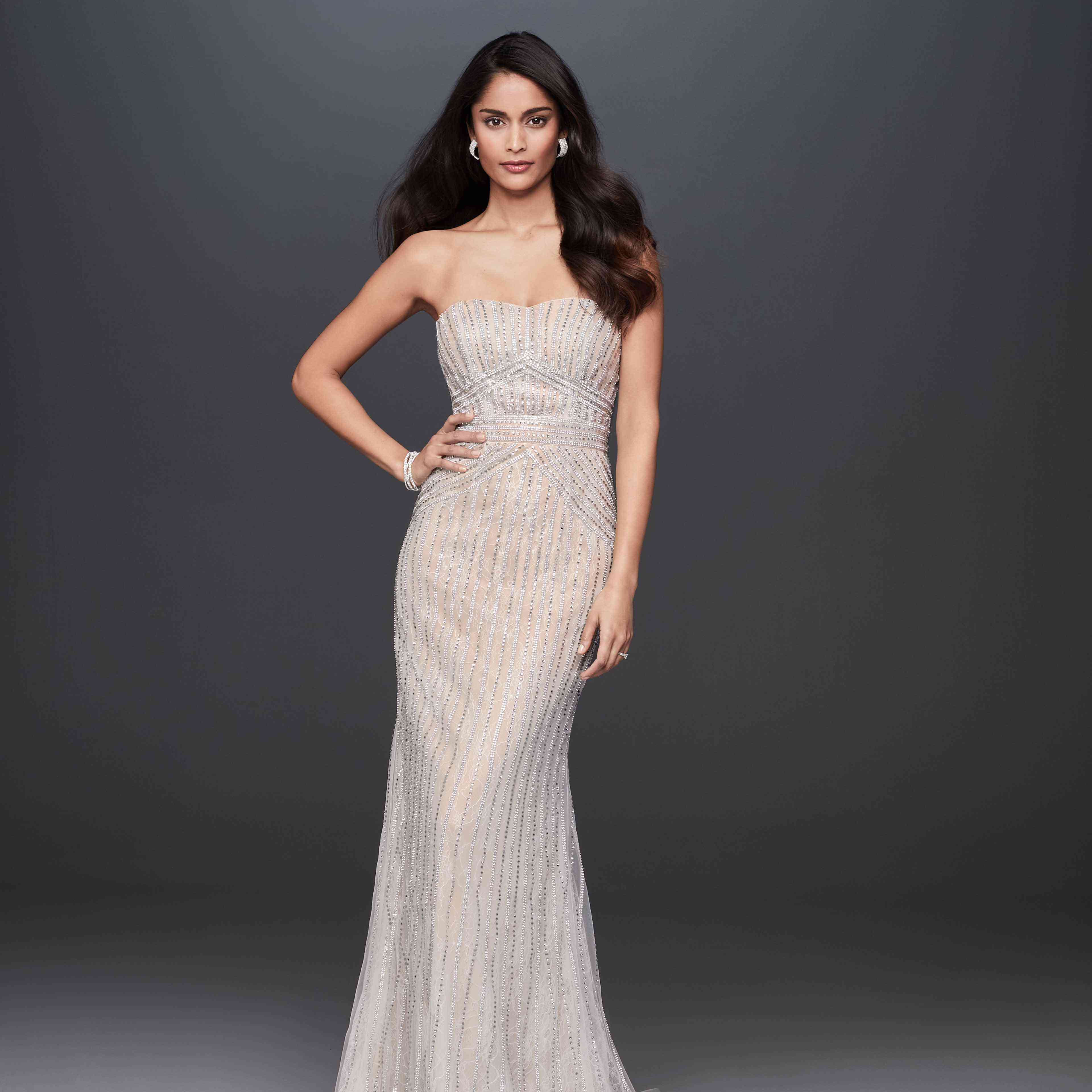 SWG829风格,无肩带,裸色婚纱与亮片细节。