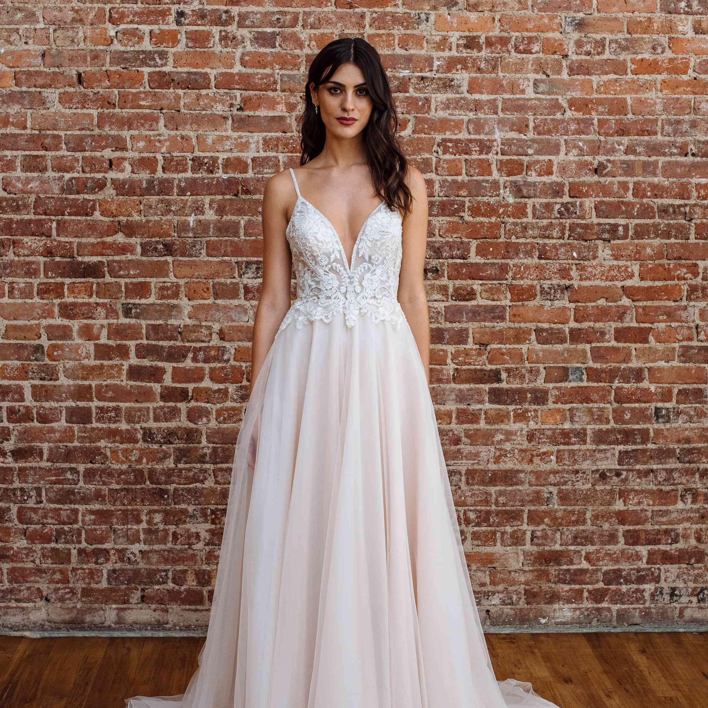 v领婚纱,蕾丝紧身胸衣和薄纱裙。