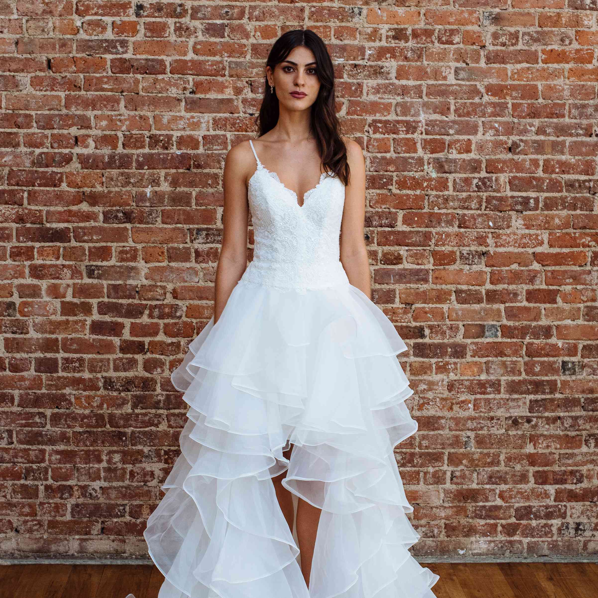 v领婚纱搭配分层薄纱裙和高低折边。