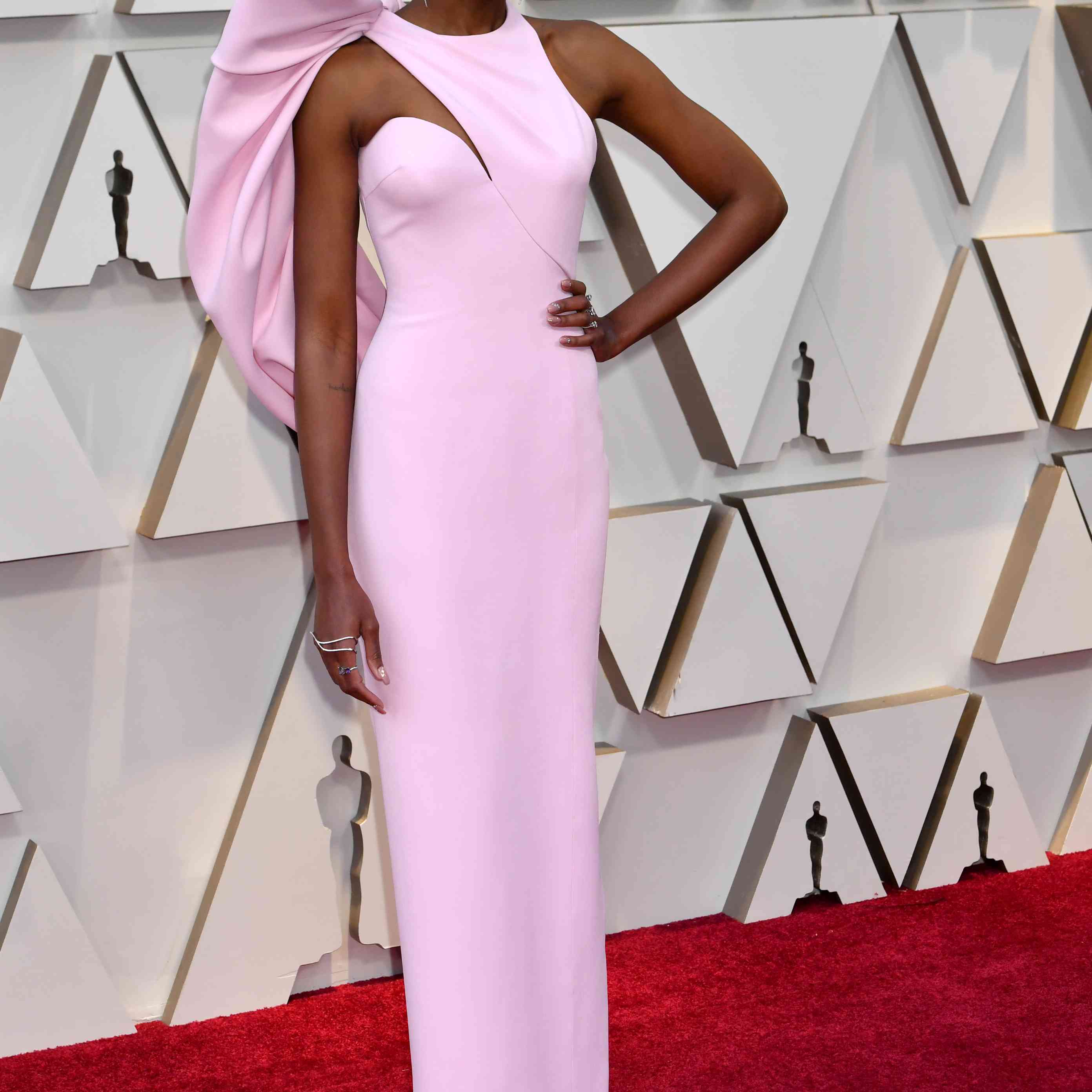 如果比尔街会说话女主角琪琪莱恩出现了,显示出在奥斯卡与戏剧性的背部细节定制的范思哲礼服粉红色的红地毯。