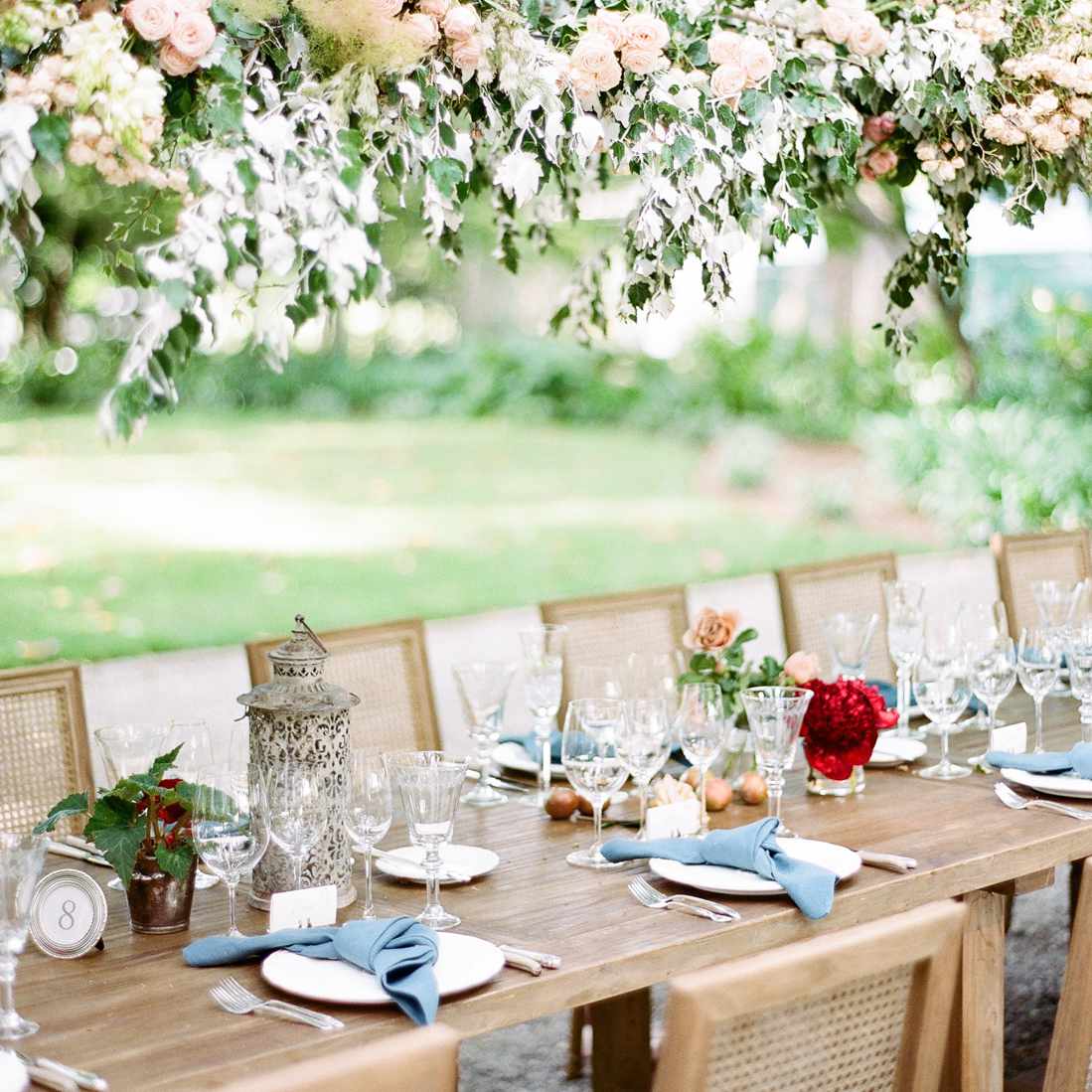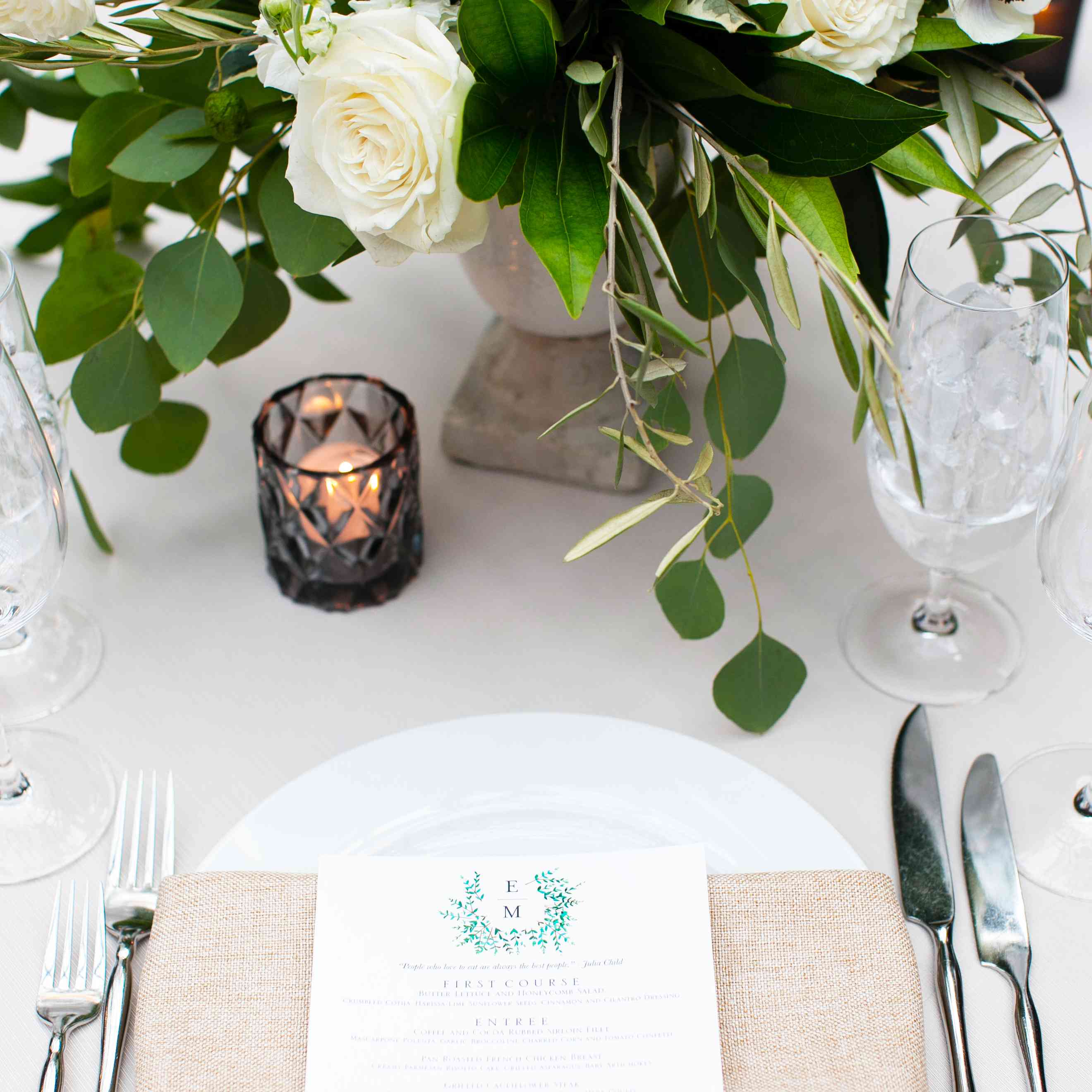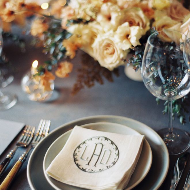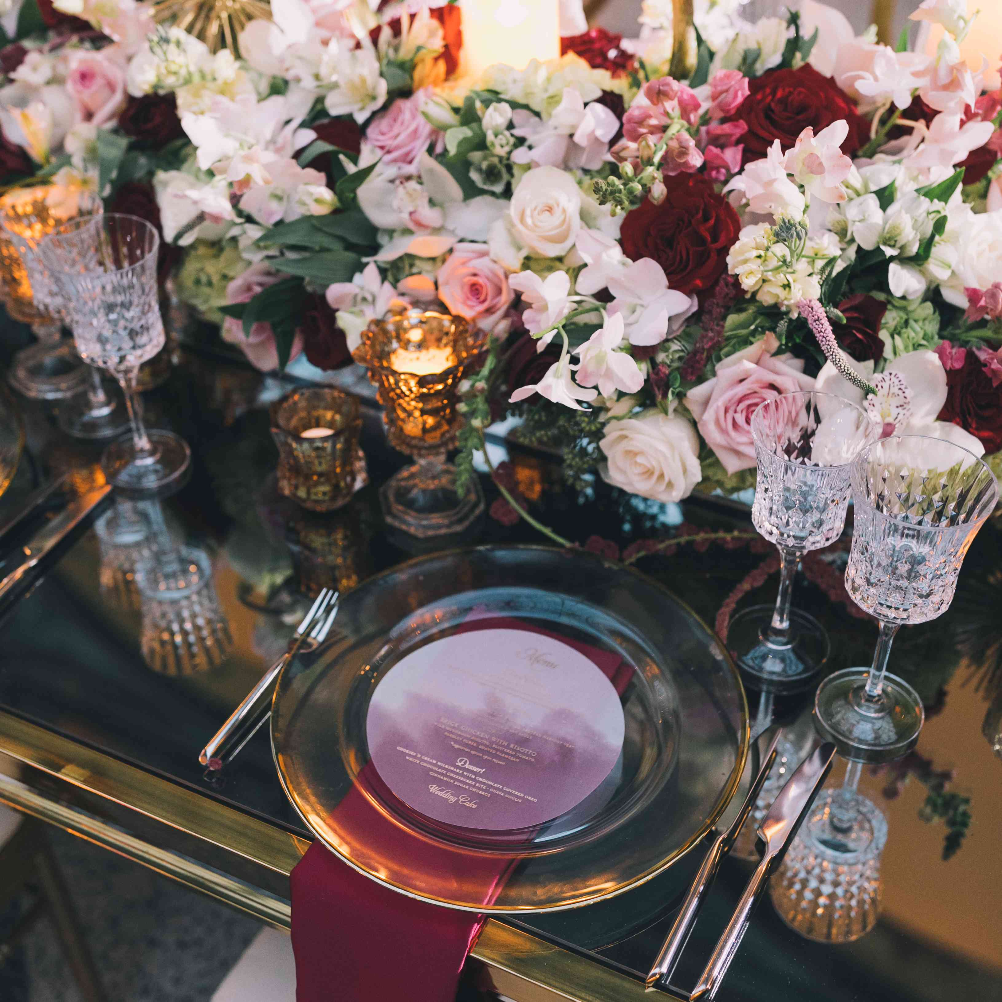 对于一个新娘,用花香来表示她的一些最珍贵的童年记忆成了她tablescape设计的元素。“此客户端,特别有作为她的父亲曾经唱她的歌(感恩而死)的血色秋海棠爱(以及颜色),和她已故的母亲栽种在她的院子里,当她长大了,”斯蒂芬妮·科尔,首席规划师和创始人科尔德雷克。