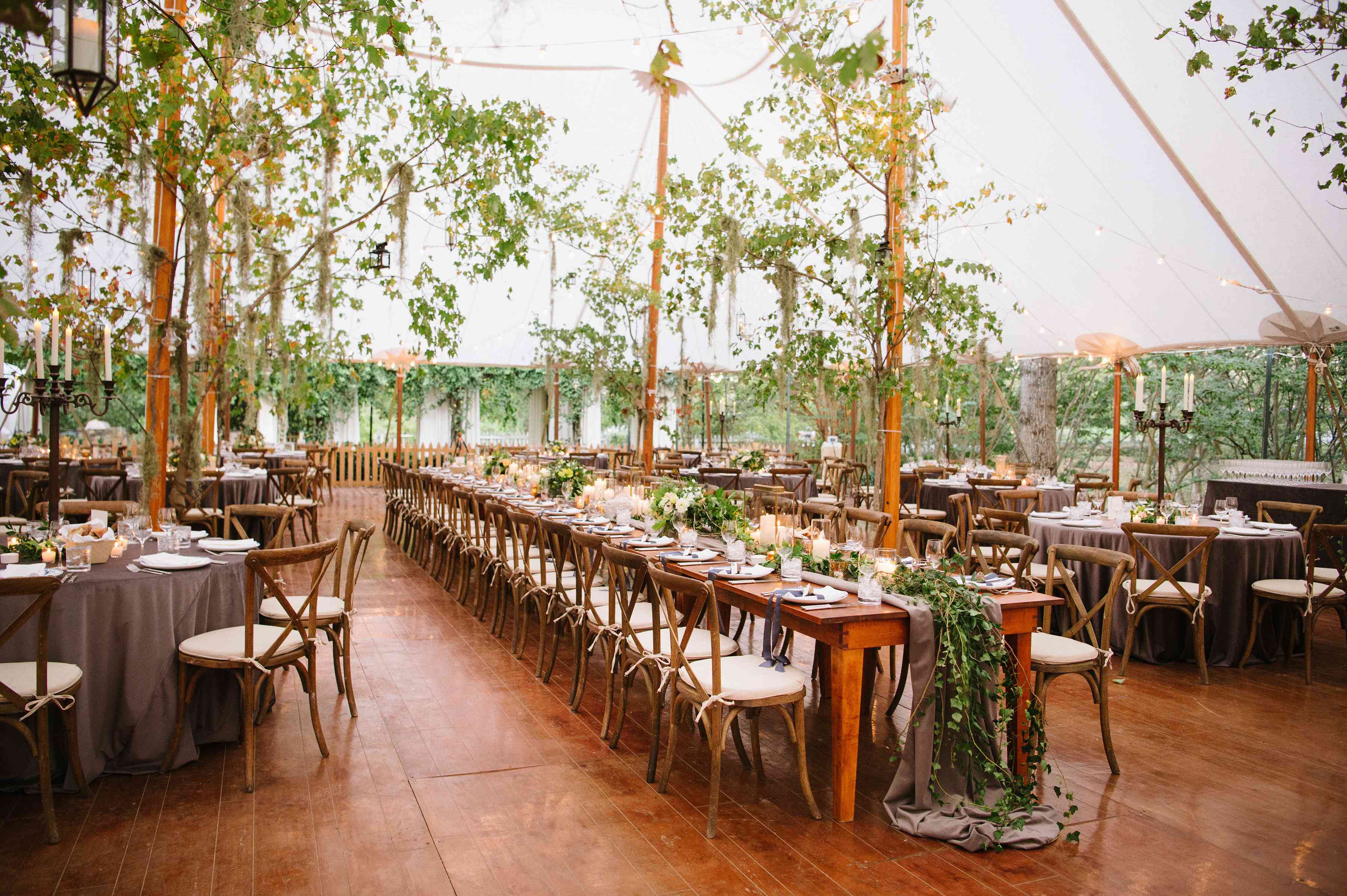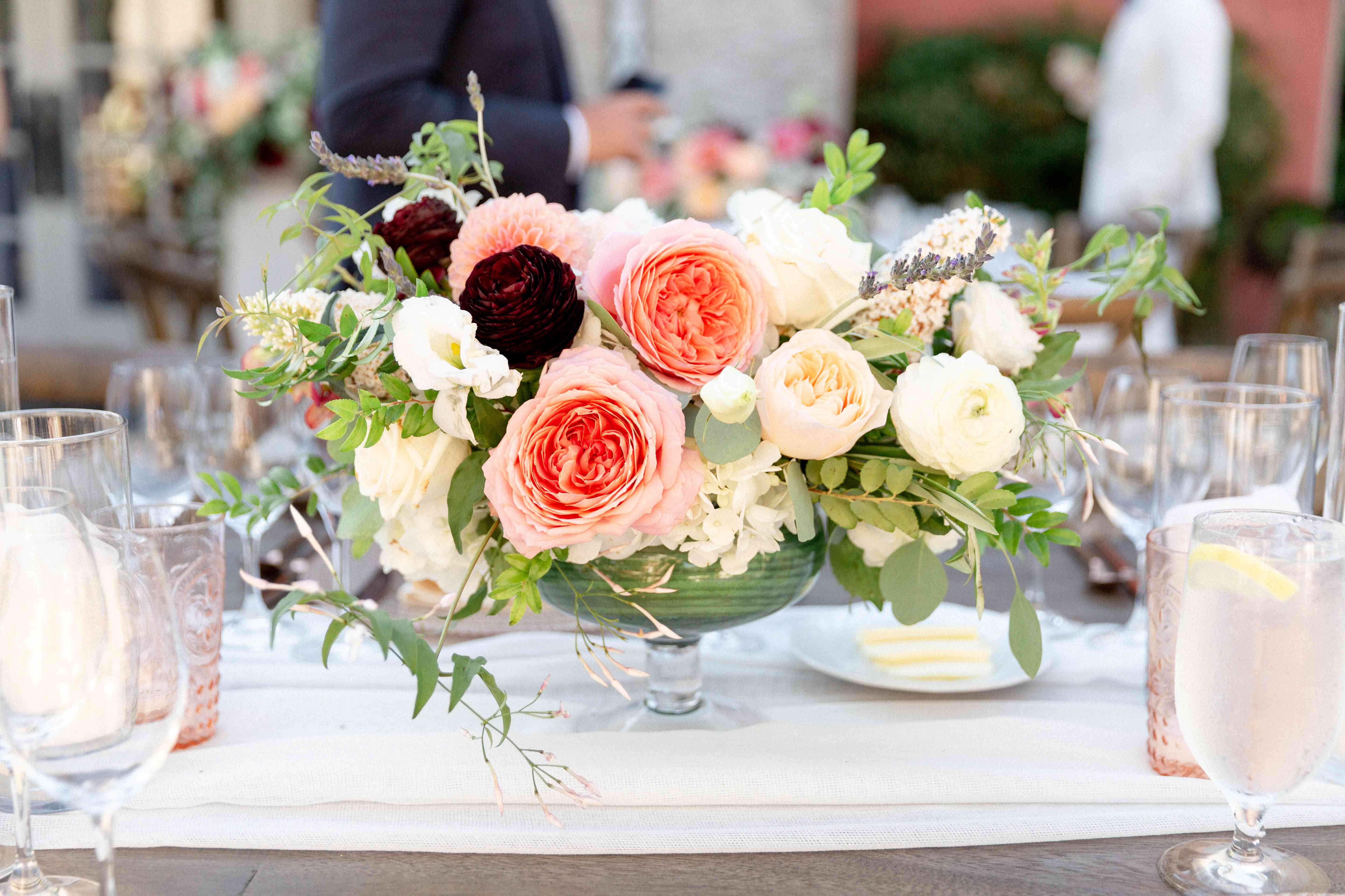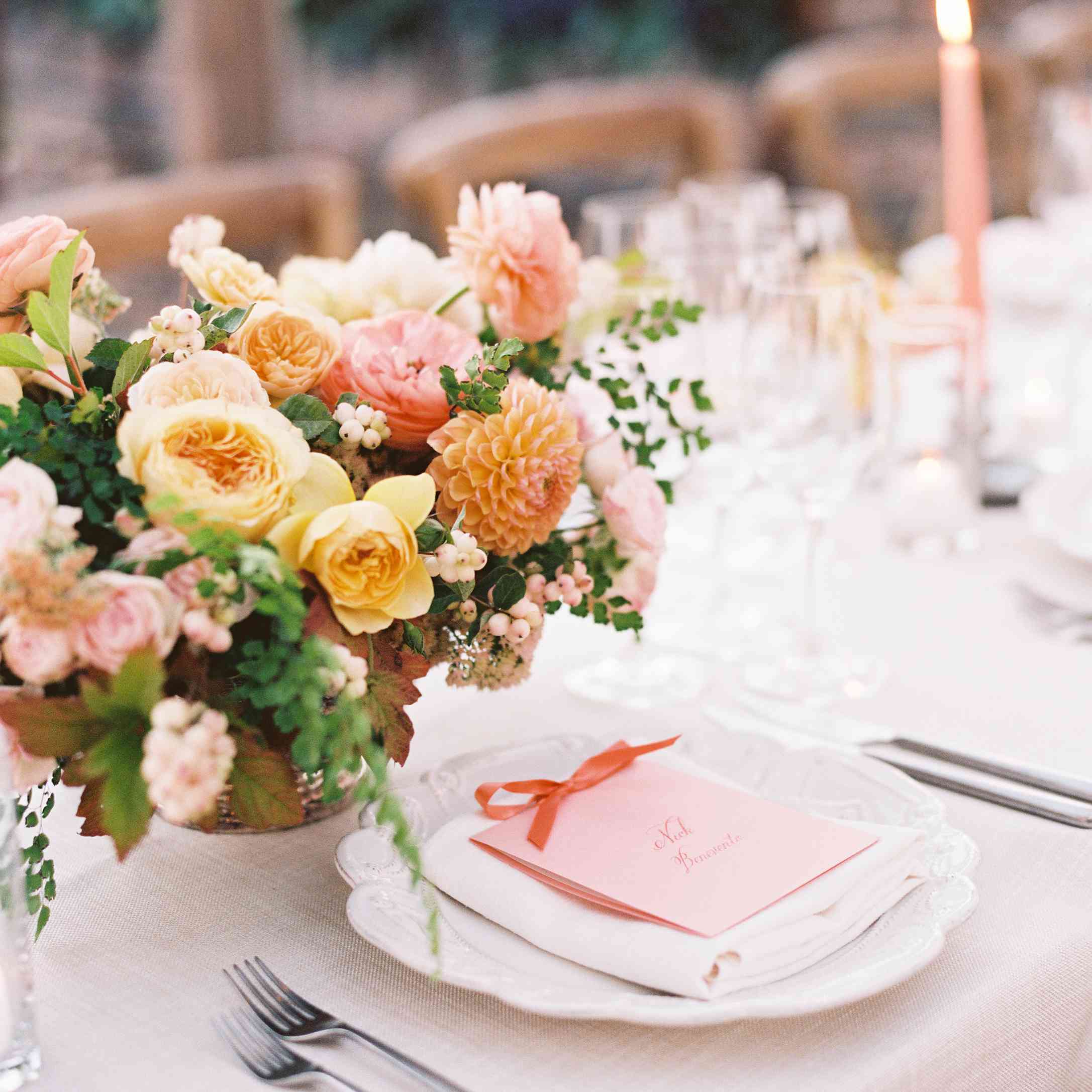 对于一个新娘,用花香来表示她的一些最珍贵的童年记忆成了她tablescape设计的元素。“此客户端,特别有作为她的父亲曾经唱她的歌(感恩而死)的血色秋海棠爱(以及颜色),和她已故的母亲栽种在她的院子里,当她长大了,”斯蒂芬妮·科尔,首席规划师和创始人科尔德雷克。
