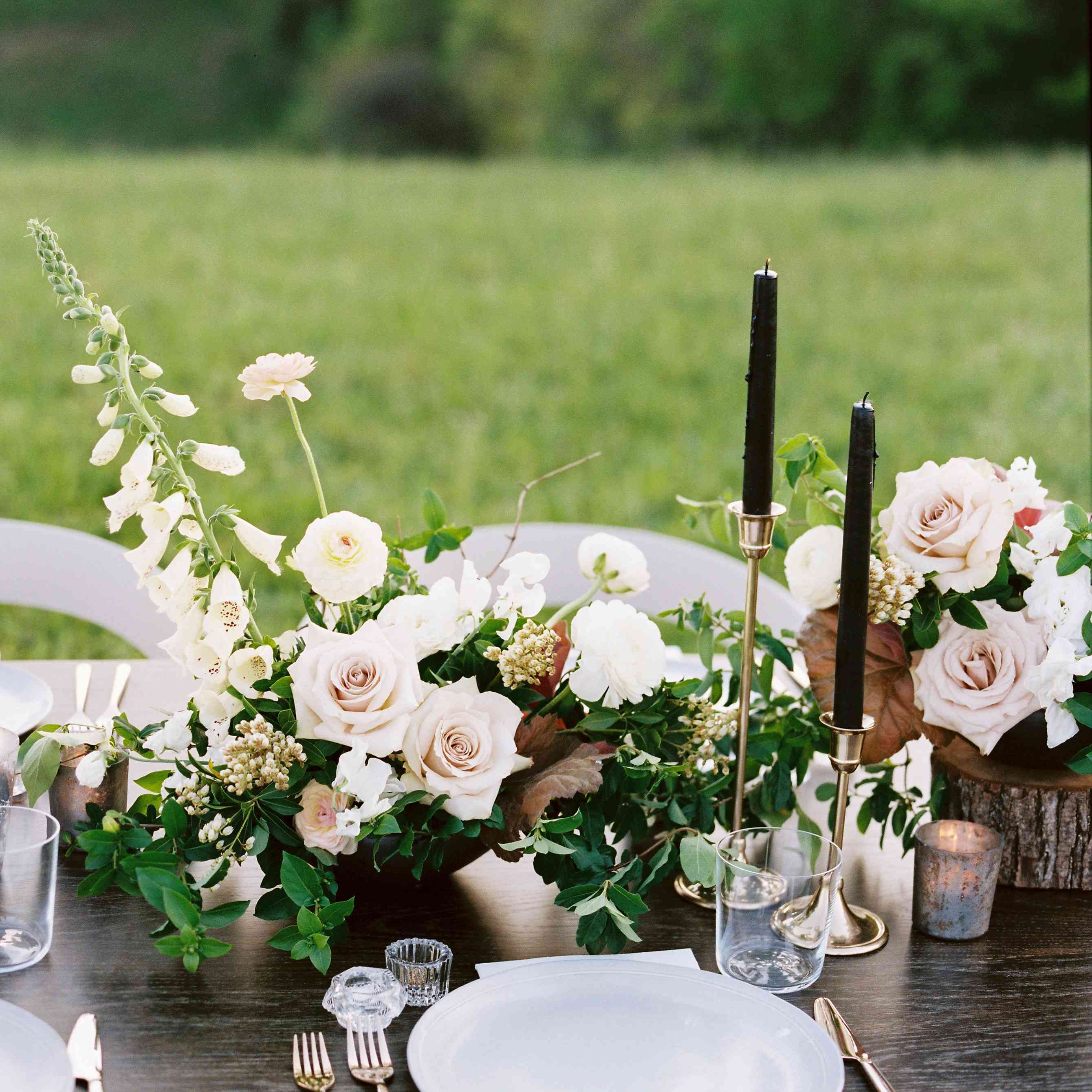 对于任何婚礼调色板别致的选择,希望看到tablescapes黑色的口音远播。“在色彩的黑色烛台的复杂性形成鲜明对比从腮红核心在最后的照片使这个显示真正出色的,说:”阿什利Sawtelle,所有者阿什利Sawtelle。
