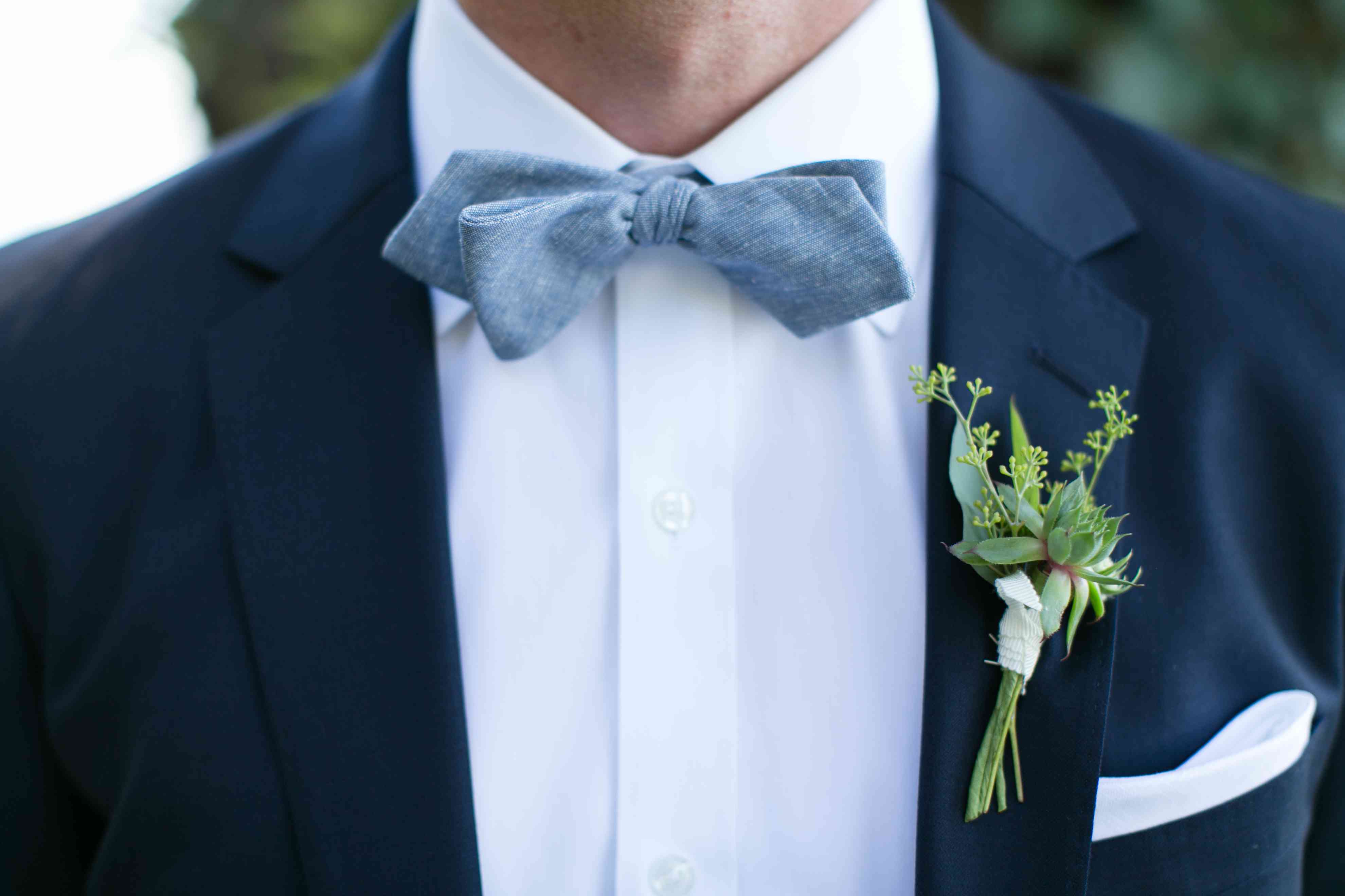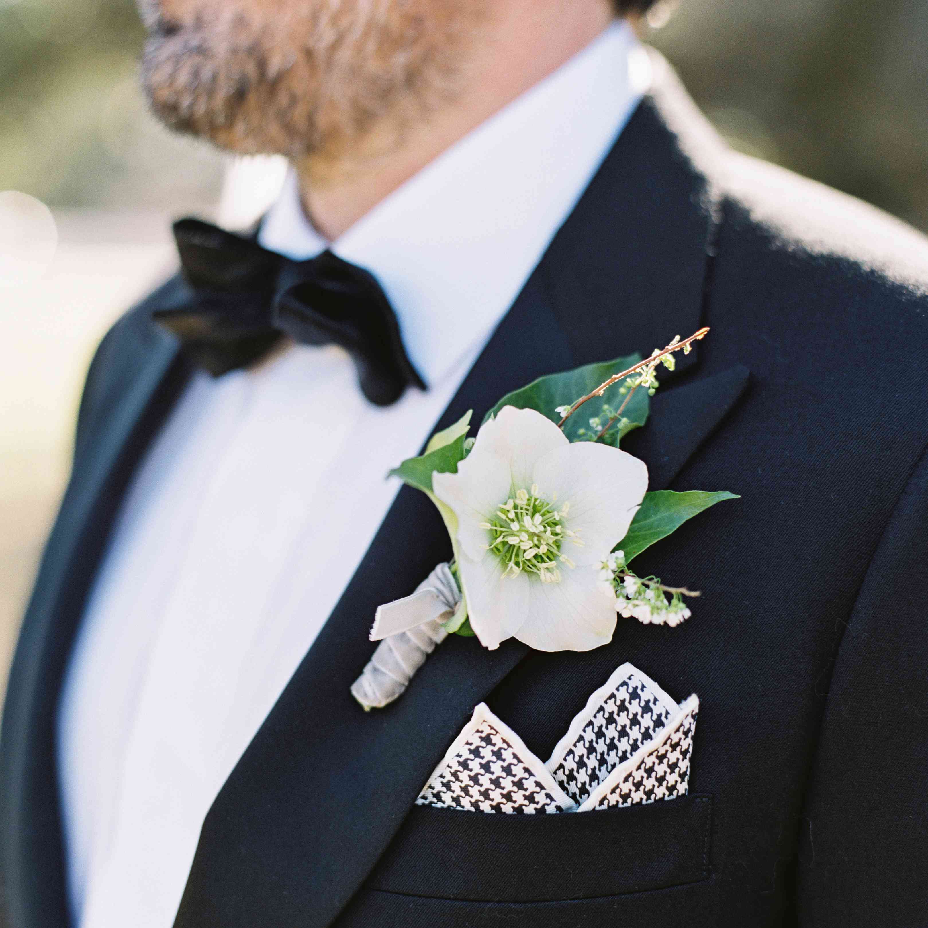 正装婚礼需要经典的胸花。让你的花店挑选一朵明亮的白色花朵,让你的新郎的西装显得更有特色。