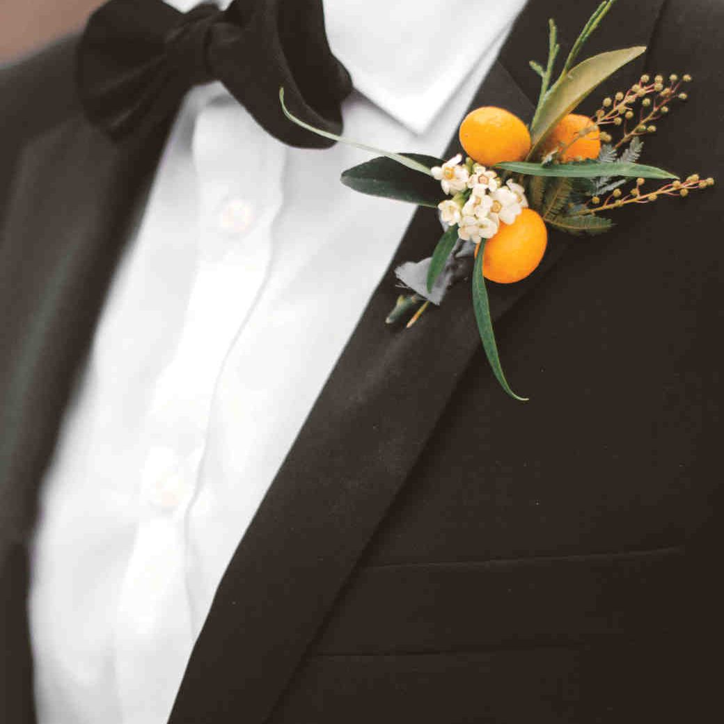 在你的新郎的风格中加入一些意想不到的柑橘类水果,带给他春天的味道。我们喜欢这个迷你橙色的设计!