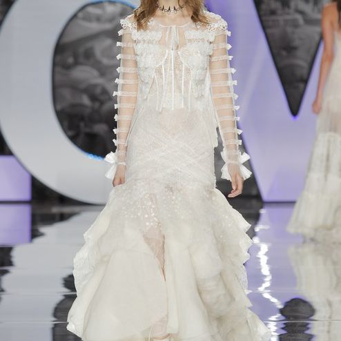 “Pobeda BlusaŸVestido”婚纱领口高,长袖,并通过YolanCris前高后低的裙子。