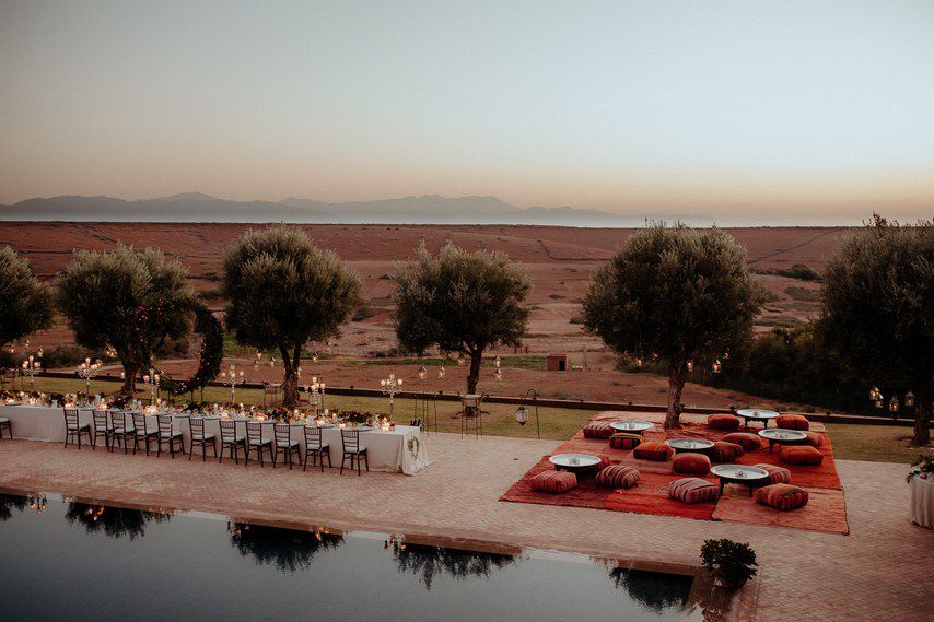 我们喜欢这个休息区与餐桌的距离!把它们放在这么近的地方是一个有趣的想法,这样你就可以在甜点上完后就和它们混在一起。此外,注意红色的地毯和垫子是如何完美地融入自然景观的。