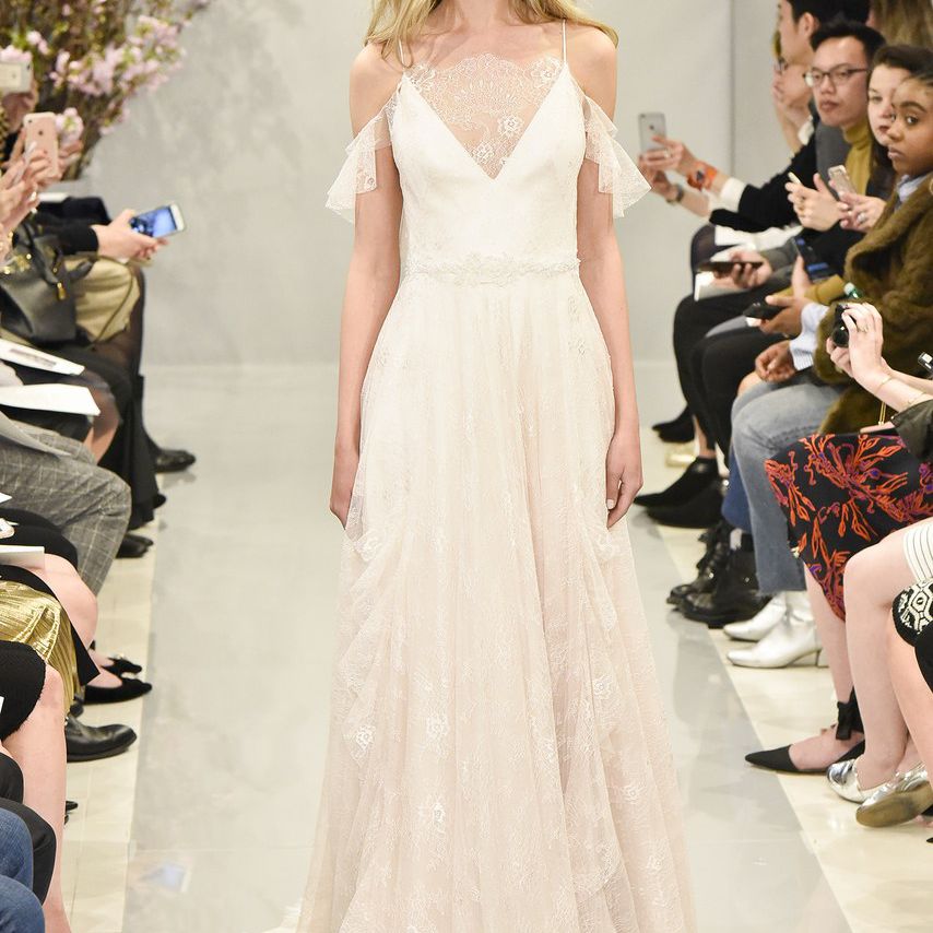 露肩式婚纱,镶有碎花花边Galia Lahav表示