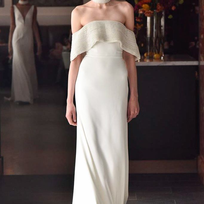 “温莎”分层珍珠露肩绉礼服与珍珠颈链,由莱拉·罗斯。
