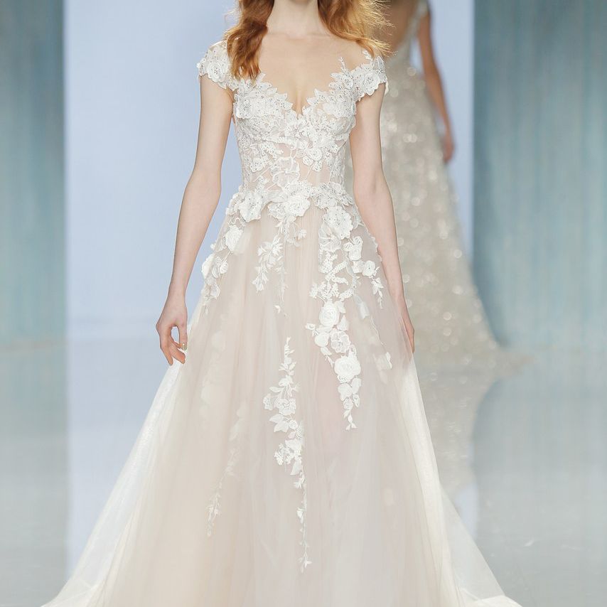 “Sylvie”传统的花卉花边婚纱,配以舞会礼服的轮廓,长长的教堂裙摆,微妙的甜心领口,和浪漫的露肩袖,伊内斯迪桑托