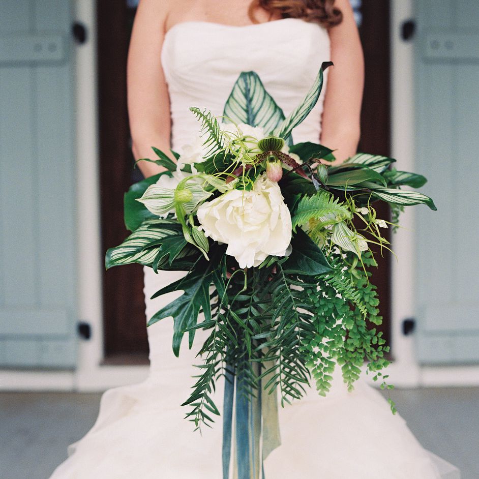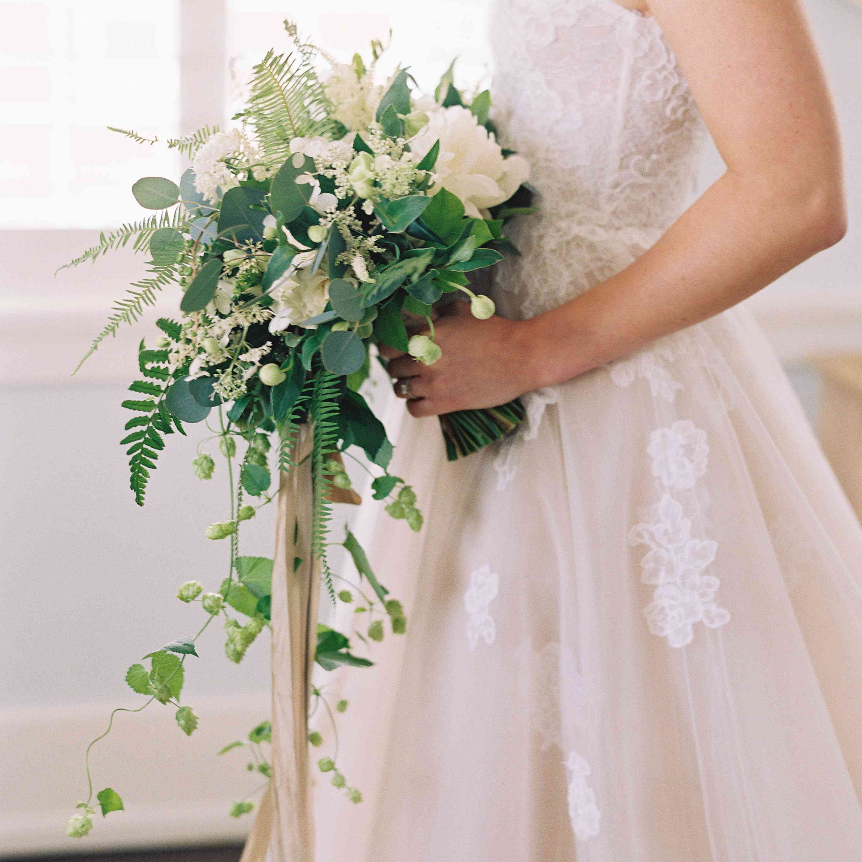 雪莉·斯宾塞,合伙人南部的花朵她认为,新娘们正在偏离前几年的狂野安排,回归更传统的东西。斯宾塞解释说:“有些人会自然地采集花束,但不会太大,让人联想到他们母亲的花束。”层层叠叠的绿叶和精致的丝带完美地点缀着传统的蓓蕾。