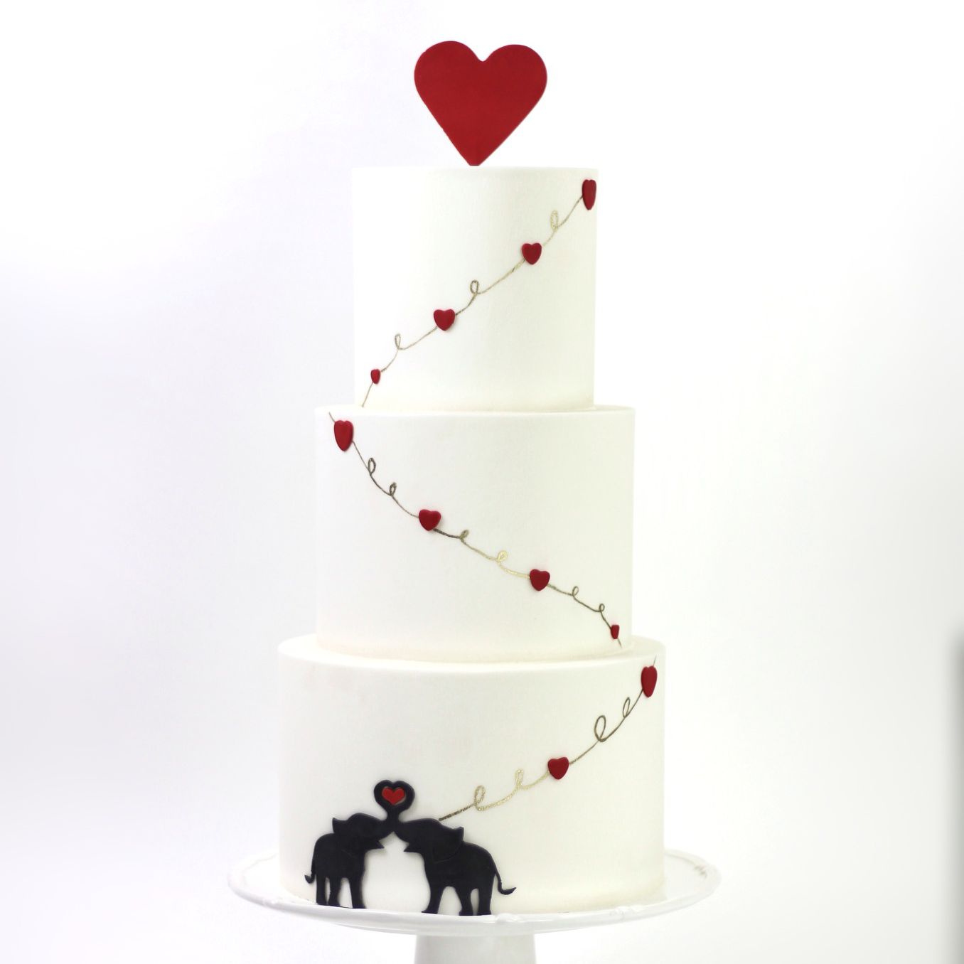 几个大象,异想天开的装饰和心蛋糕拓盖将这个经典的白色婚礼蛋糕转变为情人节的甜点。