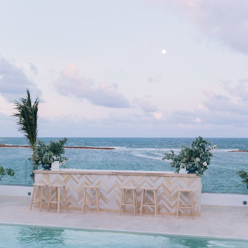 Farryn韦纳的影响者的Insta@jetsetfarryn和杰克Truen,在纽约市一家餐厅的创始人之一,趁着自己的海滩设置的具有写在沙子他们的名字(如何浪漫!)在他们的海滨婚礼在墨西哥的洛斯卡沃斯。