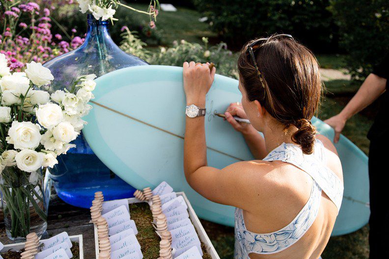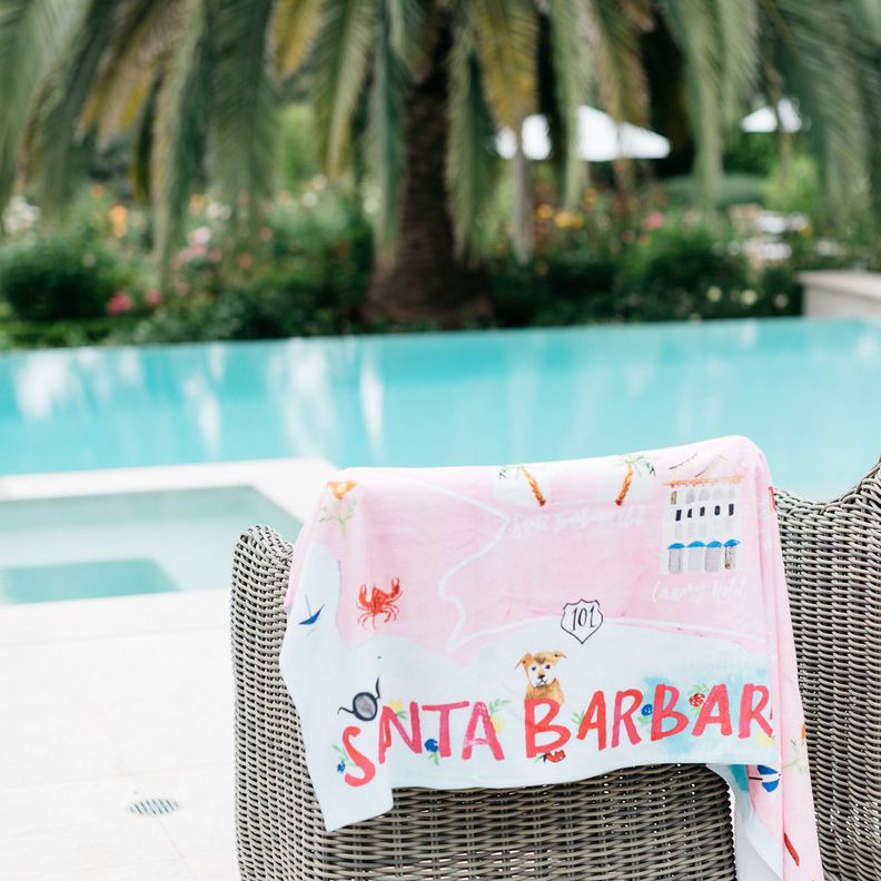 如何可爱是今年夏天结婚的想法?离开定制沙滩巾在你的客人的酒店房间,这样他们就可以在游泳池或海滩整个周末使用它们!这对夫妻创建一个映射他们的婚礼庆祝活动为他们定制的毛巾。