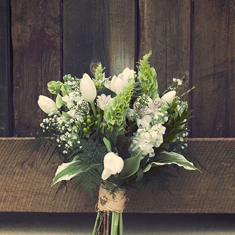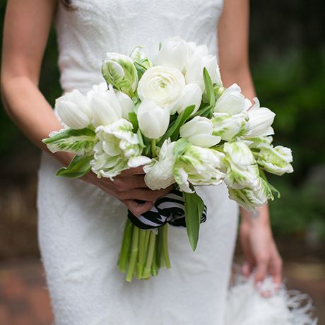 由郁金香和绿色植物组成的经典白绿婚礼花束工作室Fleurette。