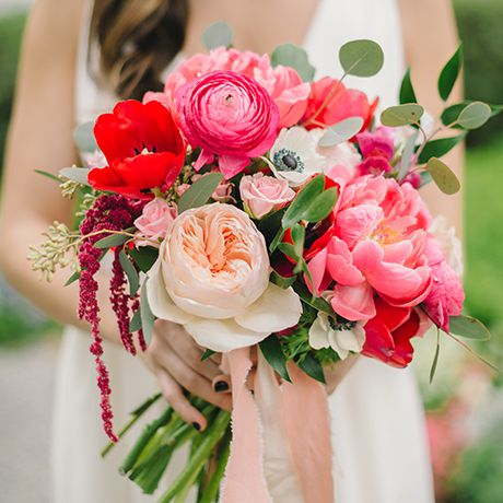 粉红色和红色花束由牡丹,玫瑰花园,茛,郁金香,海葵,和桉树,通过创建脸红和葡萄。