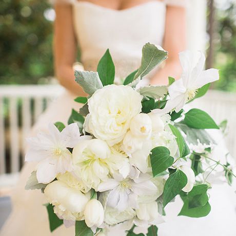 由牡丹、铁线莲和郁金香组成的经典白色花束查尔斯顿新娘。
