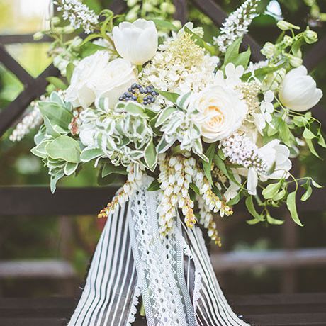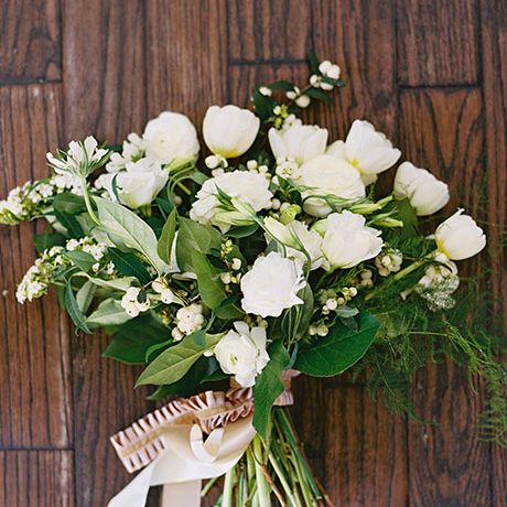 一种全白的花束,由毛茛科植物和郁金香组成花缪斯。