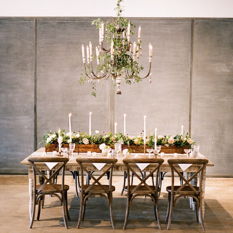 想要打造正式晚会的风格,可以在桌子上放上高高的金色烛台。因为这塔拉Guérard精心设计的婚礼证明,他们可以很容易地提升原本简单的陈设。