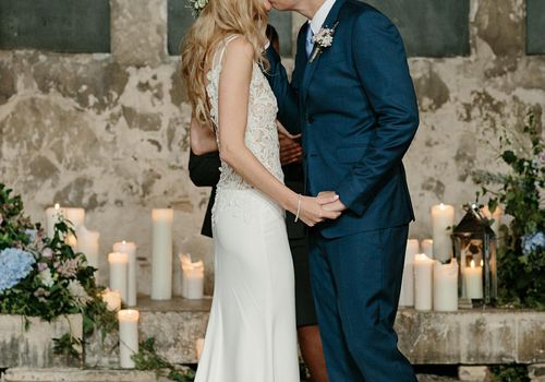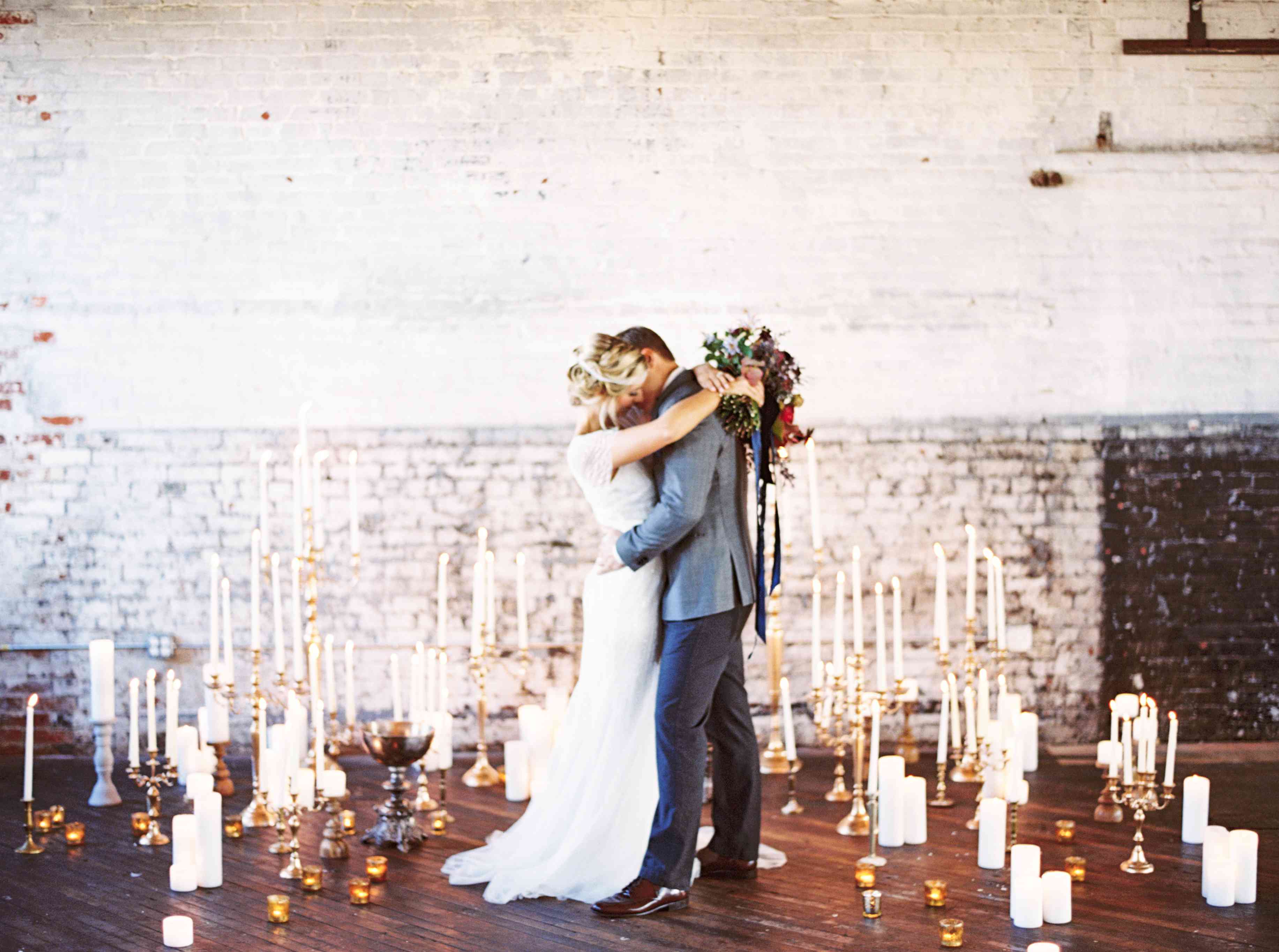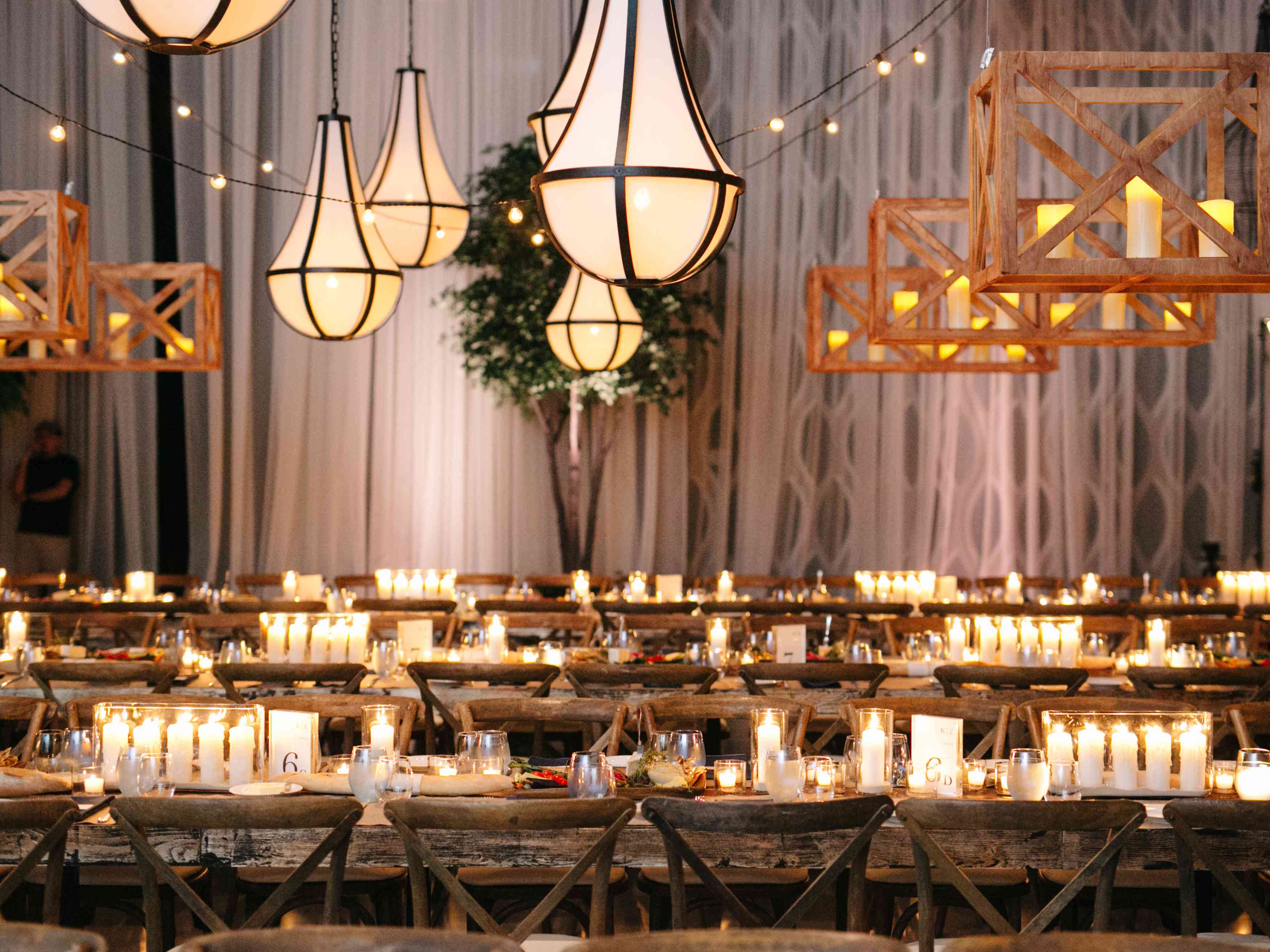这里,挂的祈祷蜡烛几何球体工业婚礼场地非常浪漫的感觉。当然,地板上额外的柱子和祷词也不会造成伤害。