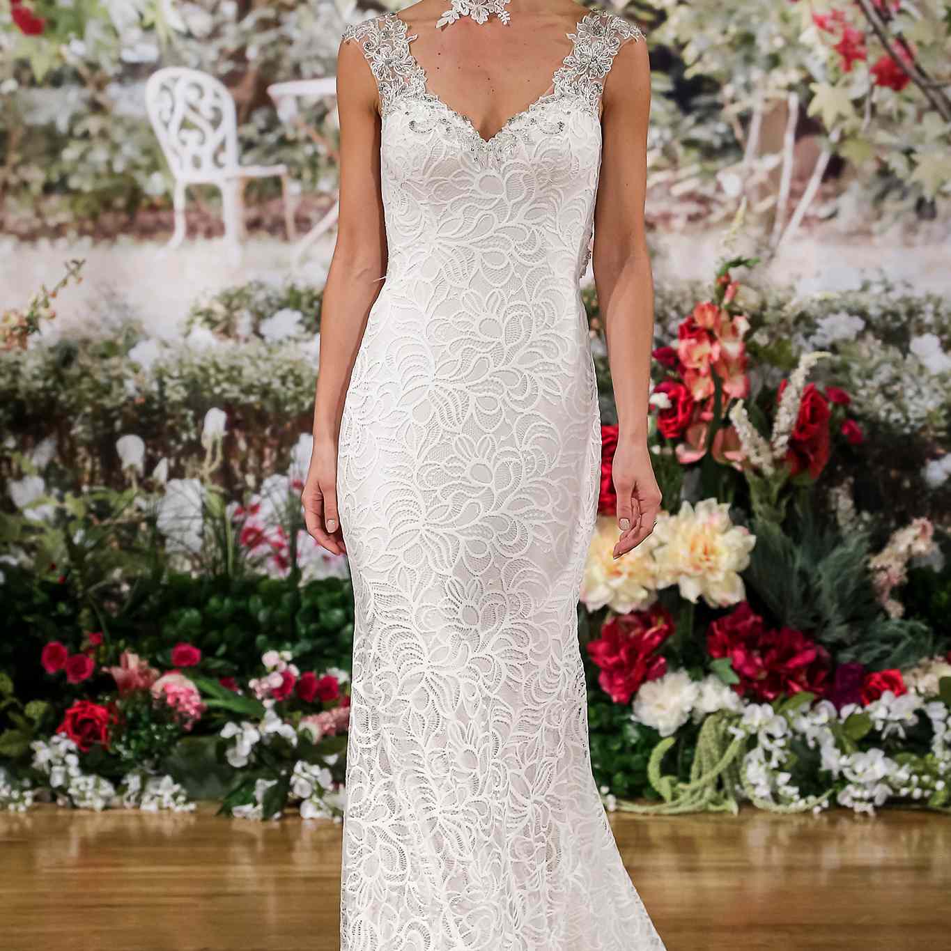 茶长婚纱花卉贴花和关闭的肩领口,由BHLDN