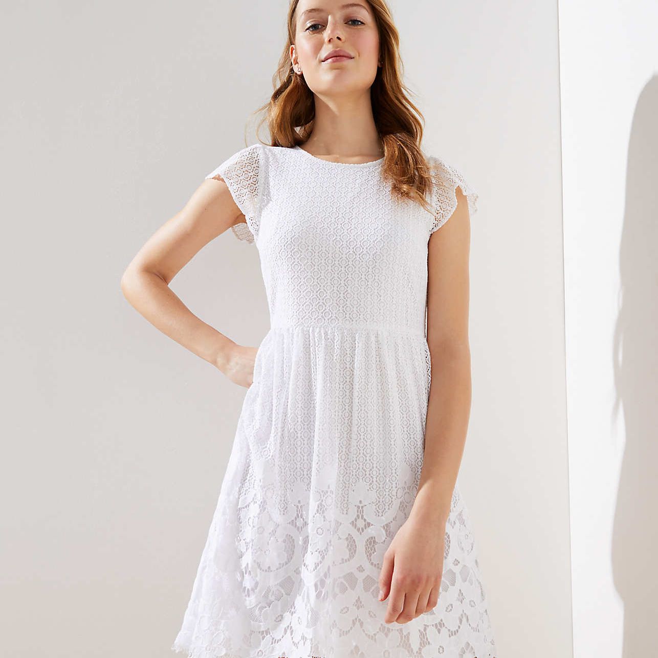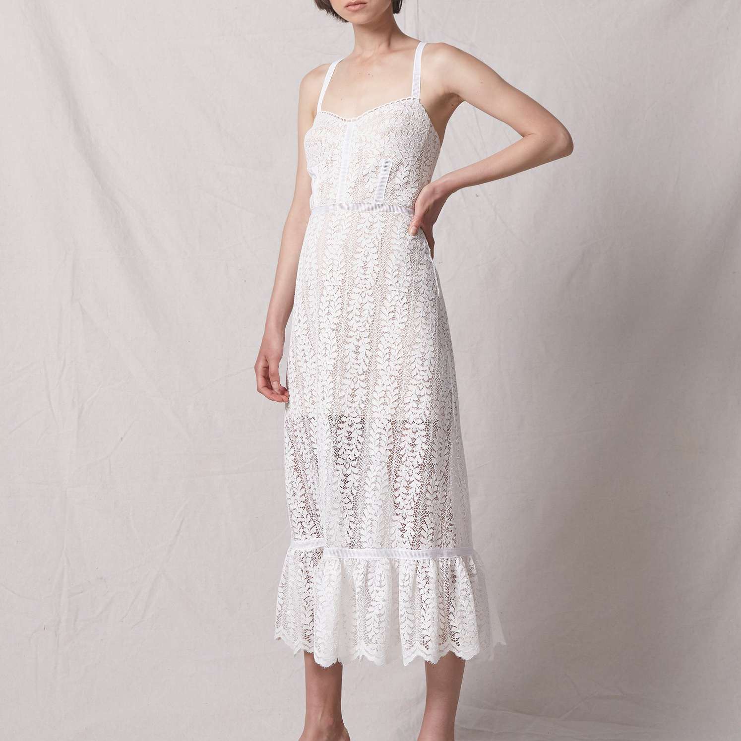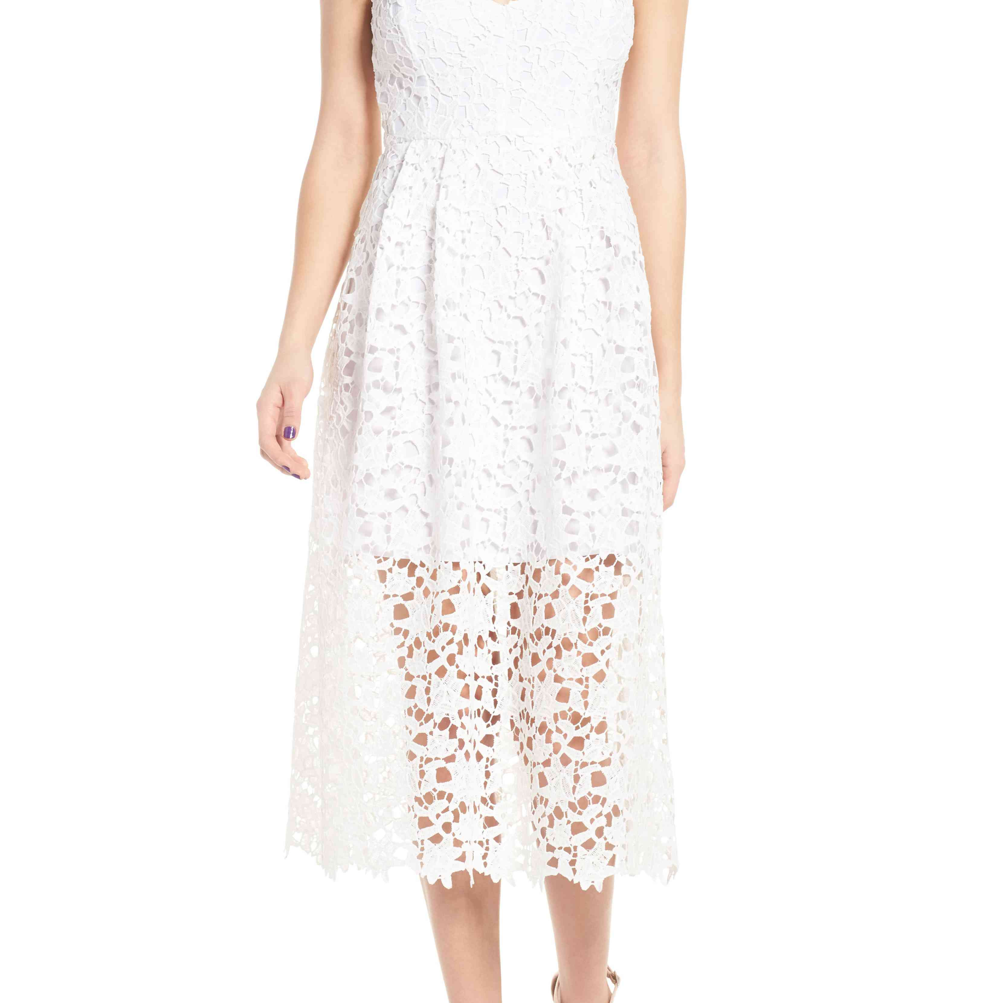 无论您是新订婚还是规划您的单身派对,排练晚宴,或蜜月,现在都可能感觉超级不可抗拒。乐动足球视频在为您的新娘衣橱购物时,您的婚纱当然是您购物清单上最重要的风格。But before you walk down the aisle in a beautiful gown, you’ll definitely want a few casual-chic or cocktail-style dresses to celebrate your upcoming marriage from your engagement party to your bridal shower and rehearsal dinner and maybe even for an after-hours celebration following your reception or a post-wedding brunch. For a classic look that feels feminine and fresh, modern lace dresses are one of our favorite styles for a quintessential bridal look from figure-flattering wraps to modern midis and simple sheaths.