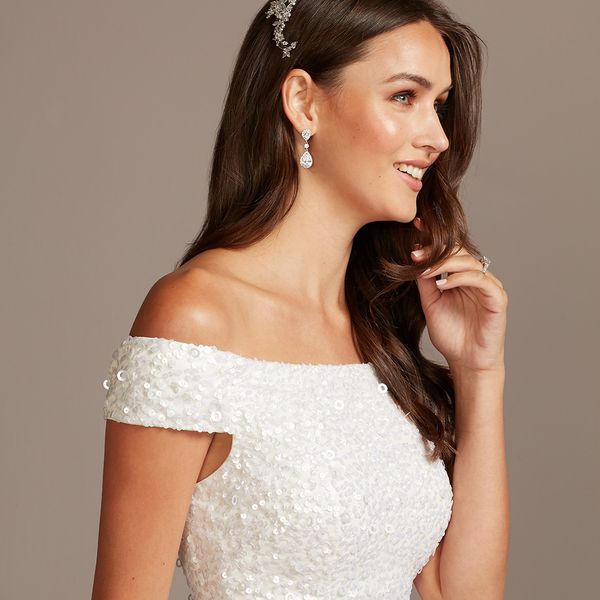 风格SWG835,装修和耀斑蕾丝婚纱与露肩领口分裂,$的1,358个,加林娜签名大卫新娘