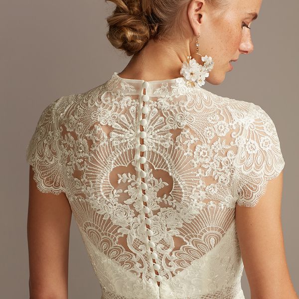 风格SWG843,蕾丝薄纱和婚纱礼服与暴跌的错觉胸衣和高领口,$ 1,258,加林娜签名大卫新娘