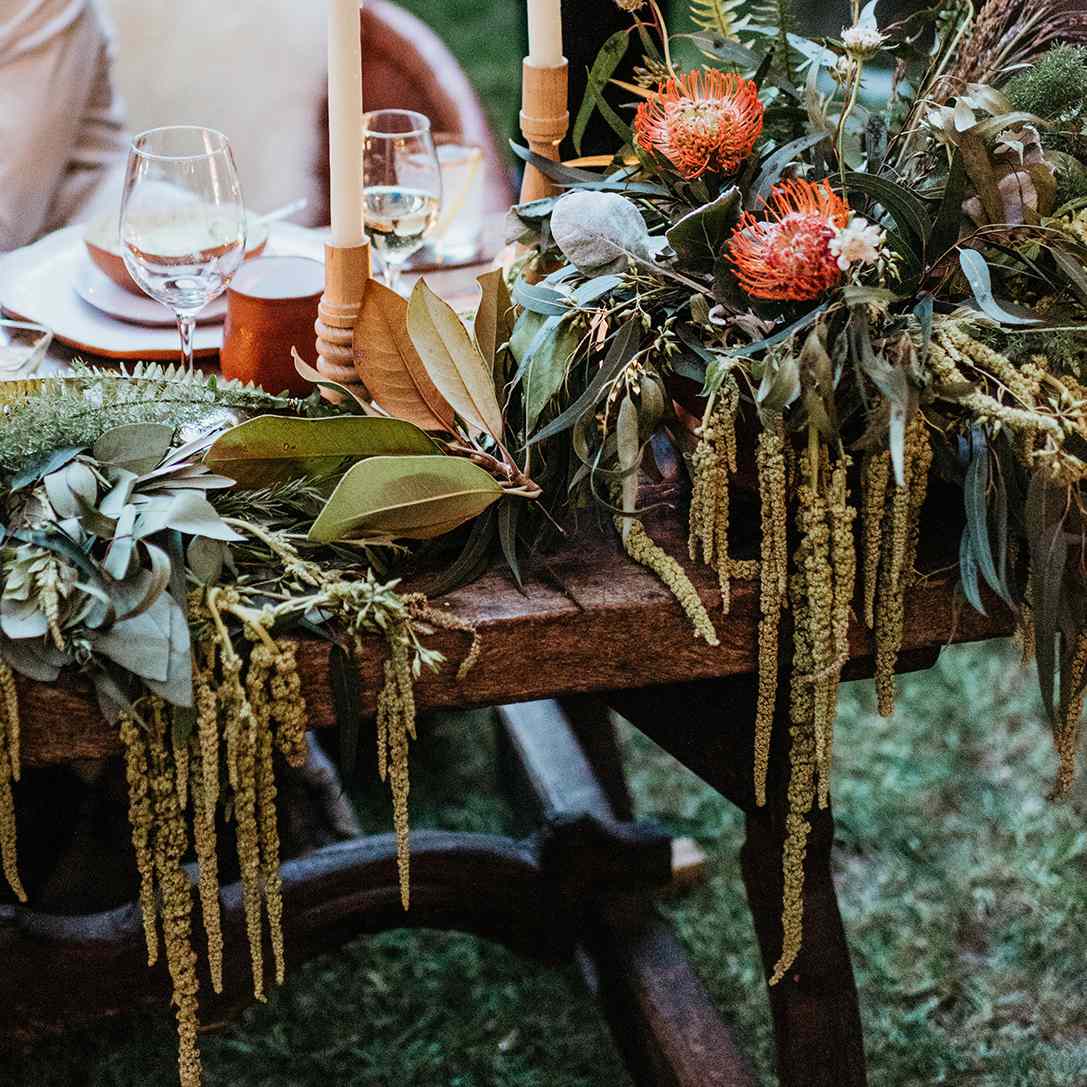 新娘从小就喜欢园艺,她承认曾给花店送过一份非常详细的清单。树上有绿叶植物(桉树和橄榄枝)、马蹄莲、娇艳的新娘,还有锈色的兰花。画龙点睛的是一个皮包,上面刻着沃尔特•惠特曼(Walt Whitman)的“我们曾经在一起,我忘记了其他”。
