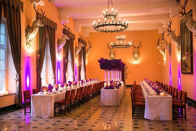 城堡内部,表是在奖杯陈列室晚餐设置。“我们让我们的花艺设计师,杰夫利瑟姆,去城里,”阿什兰说。“他用万紫玫瑰,兰花,绣球和彻底改造的房间。”