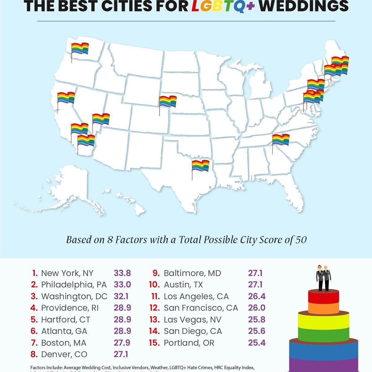 为了选出最适合LGBTQ+情侣结婚的城市,该调查评估了美国50个最大的都市地区,并评估了8个关键因素:包容性婚礼供应商、同性家庭的存在、城市非歧视条例、HRC城市平等指数平均婚礼费用入境航班的可用性,降水和LGBTQ+仇恨犯罪。
