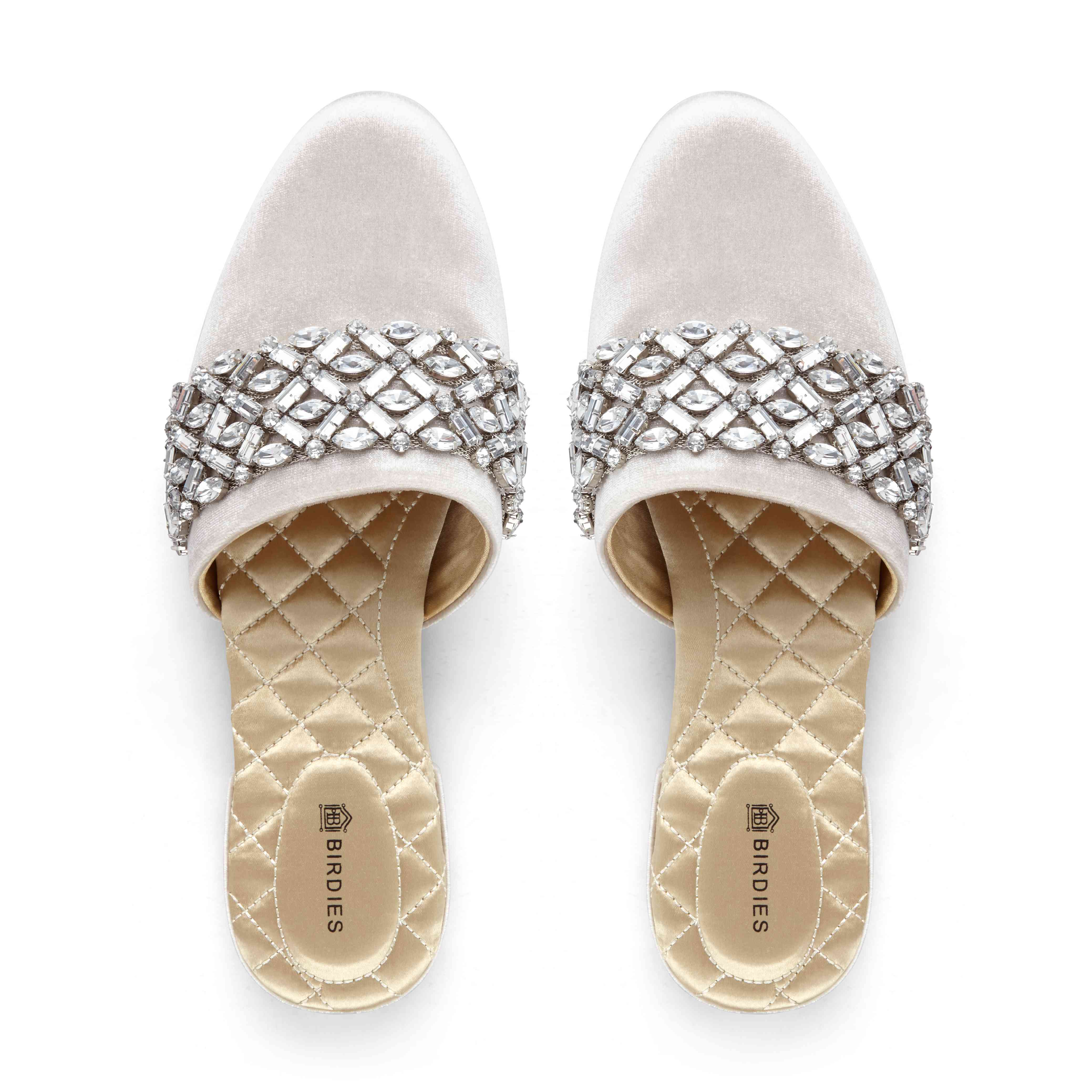 在Songbird的一个版本已经新娘写了这一切。这天鹅绒骡子是在雪晶彩,又名白新娘完成。沿着顶部,水晶装饰打扮的滑动,使得它可以完美的婚礼。或者你可以从无缝过渡您高跟鞋点缀这些舒适的公寓。如果你想有一个对比,你的婚纱礼服去与玫瑰水晶代替。