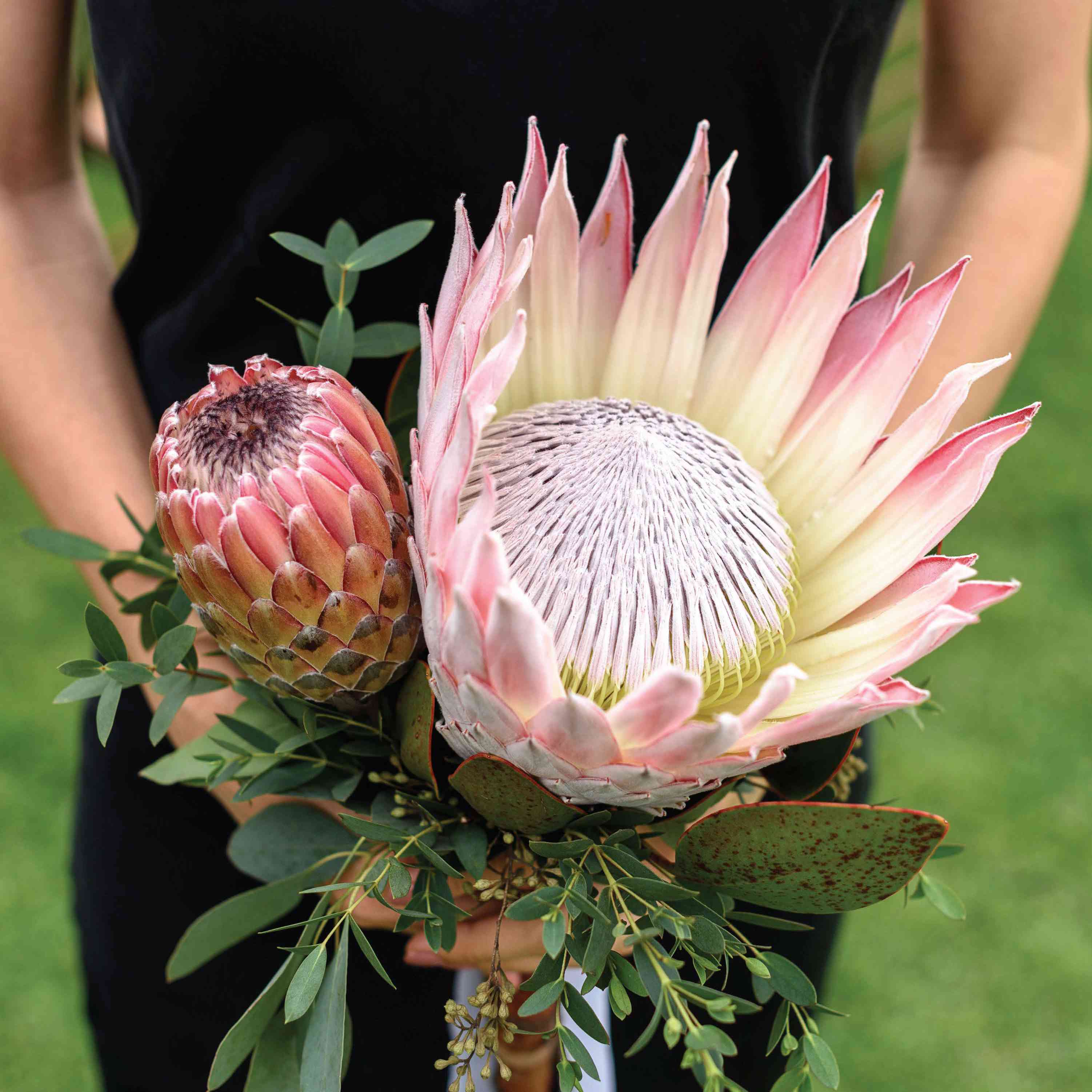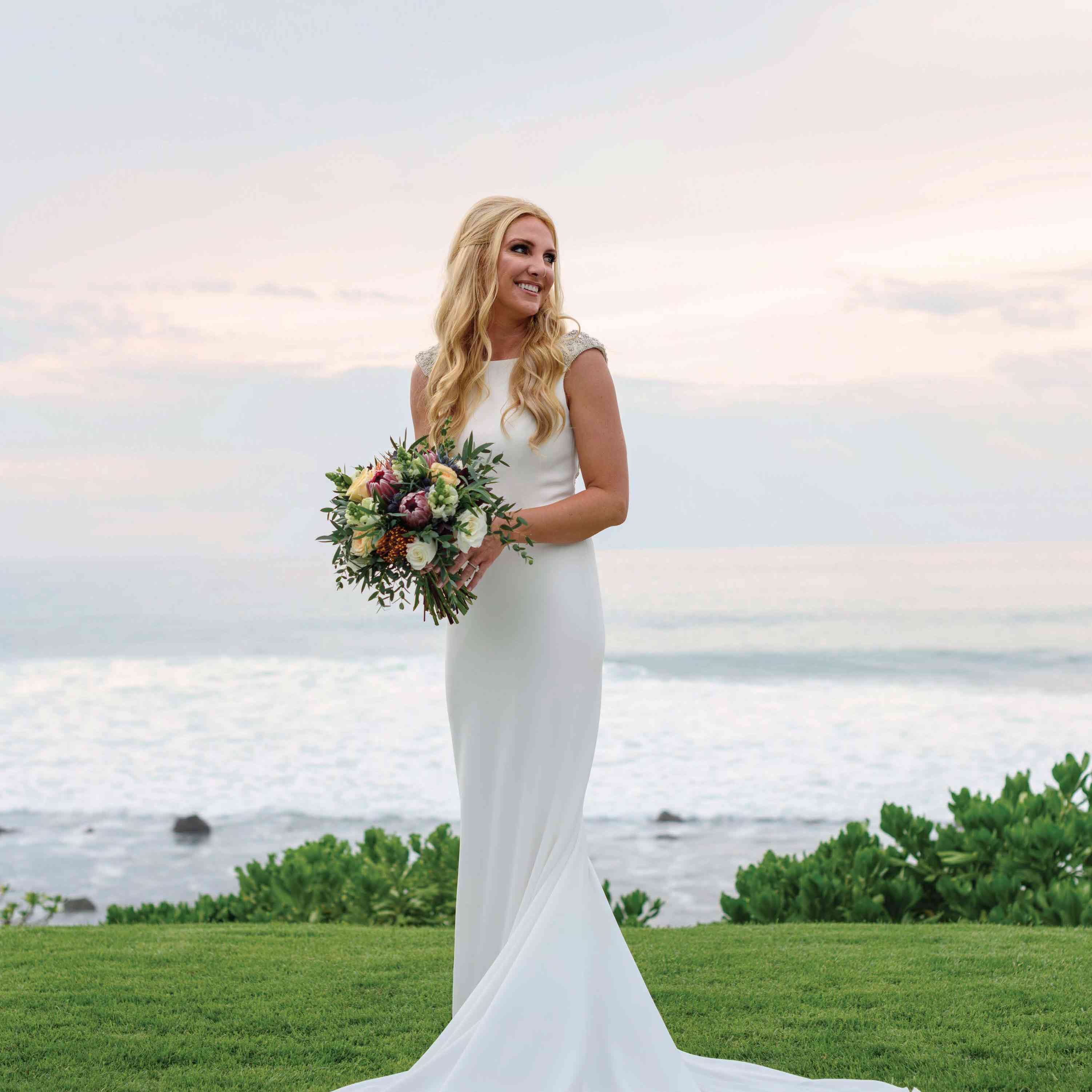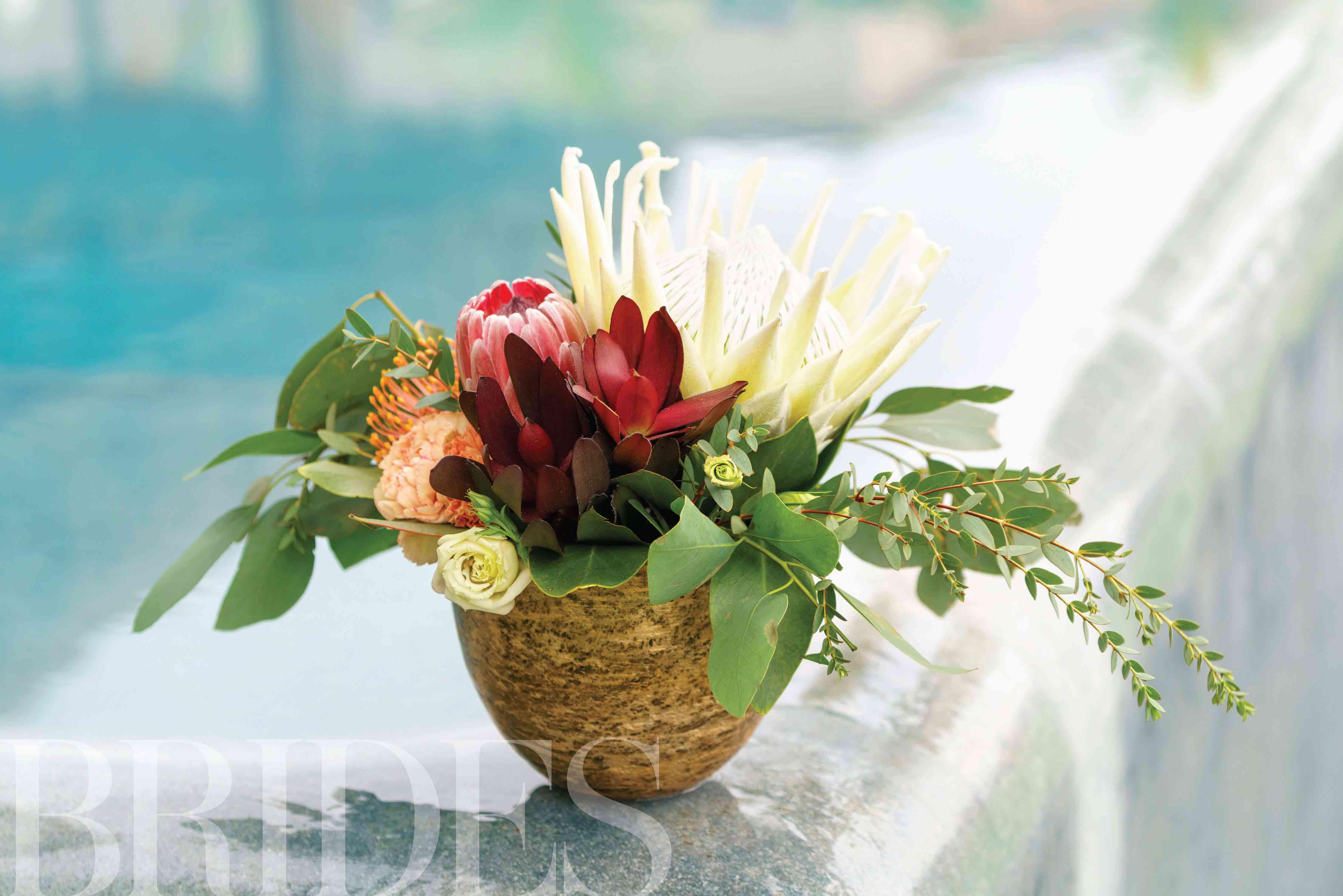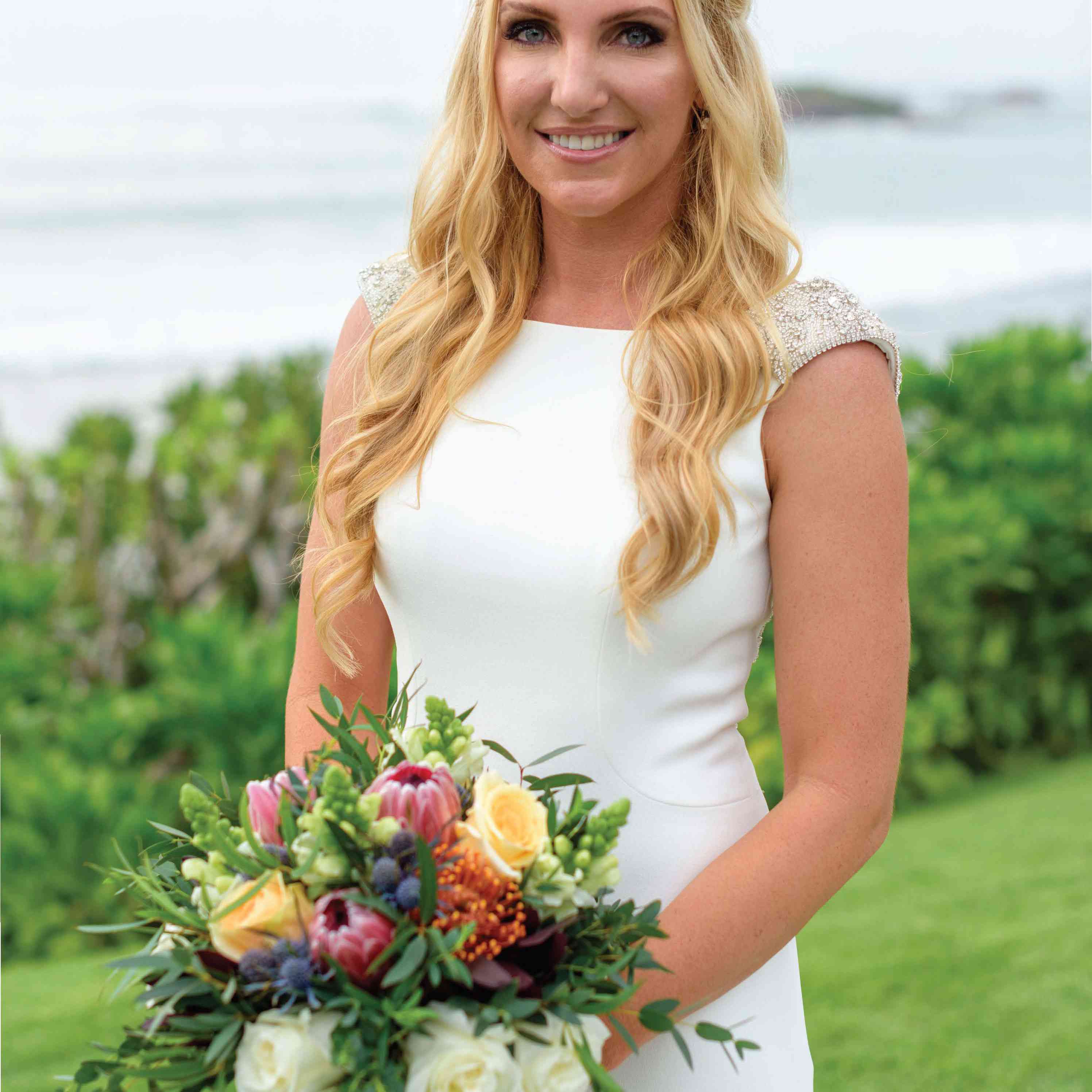 新娘的玫瑰花束,普罗雷亚,蓟和绿地非常适合杰西卡和鲍勃的目的地婚礼。像新娘一样,女仆带着海滩风格的热带王国花束。