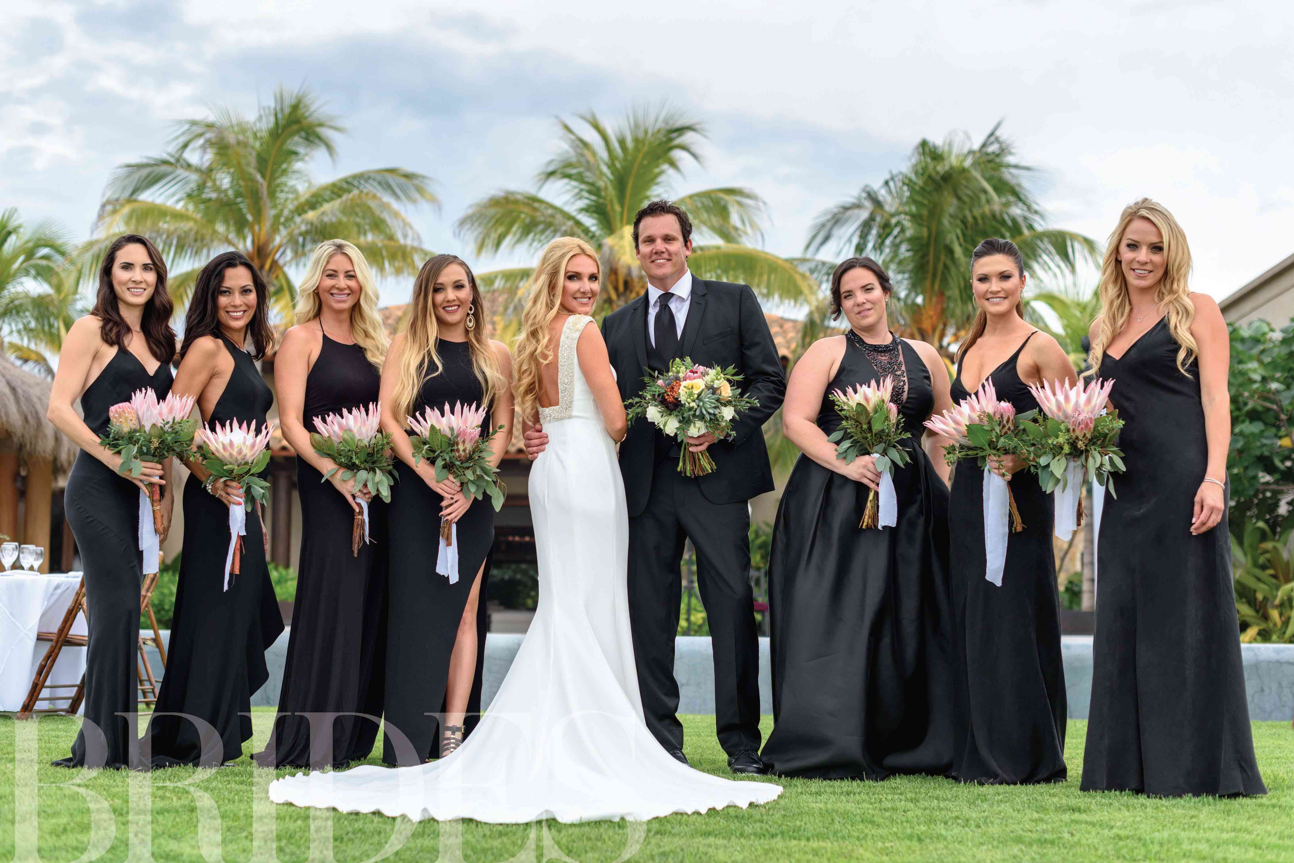 杰西卡的七个伴娘从旋转中穿着不匹配的黑色礼服。