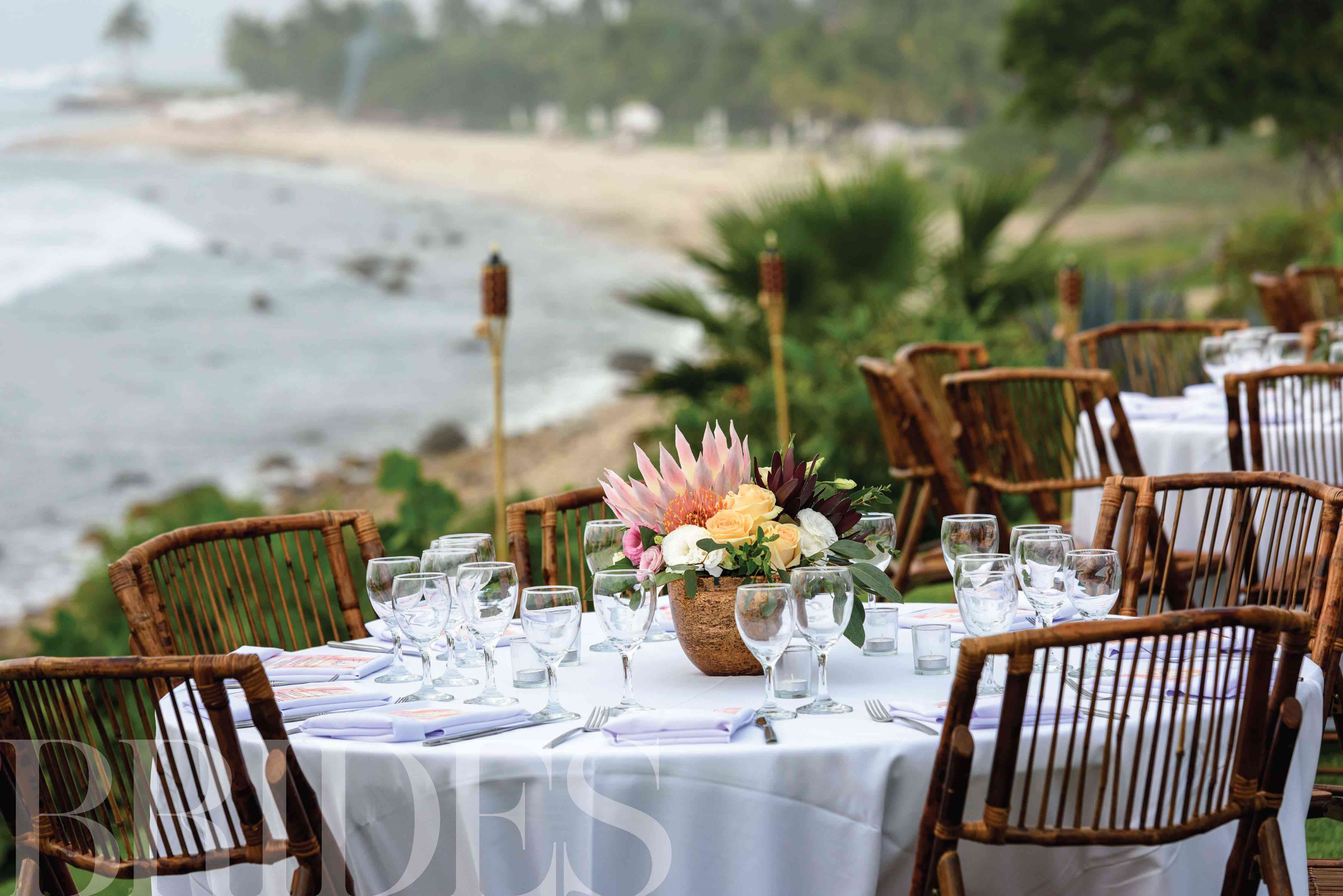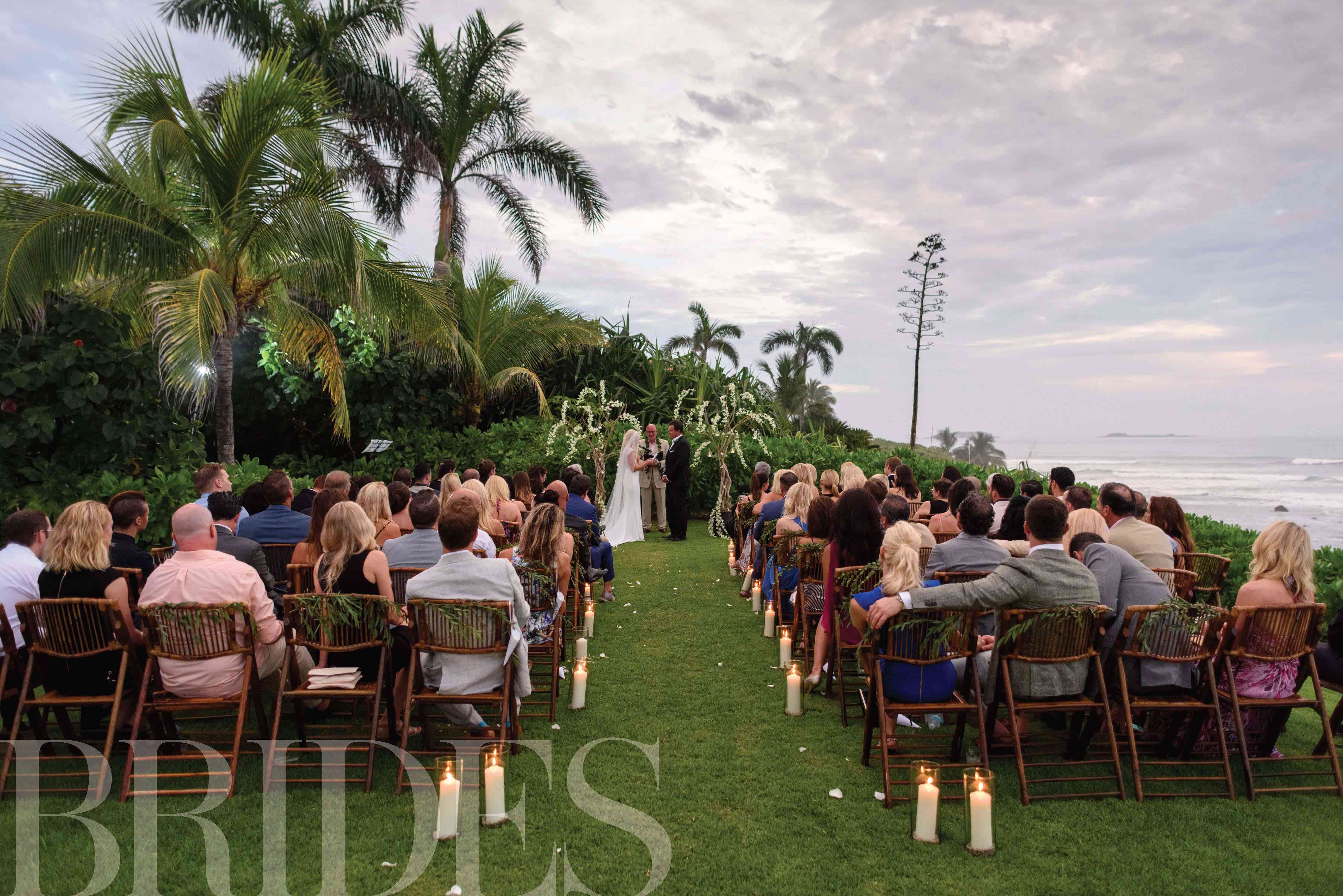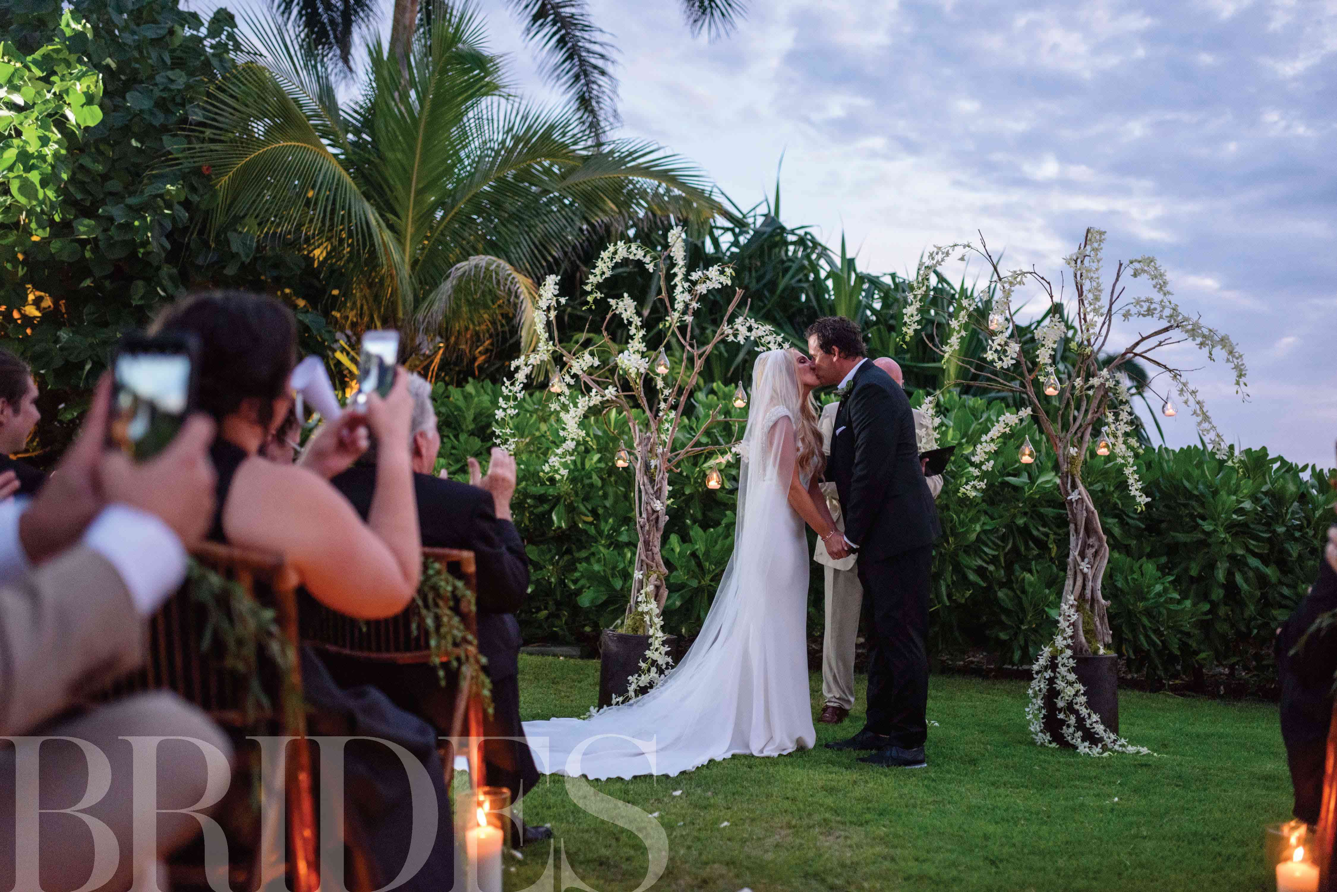 “我们依靠海洋提供了仪式的浪漫背景,”杰西卡说,但这并没有阻止这对夫妻在大量的鲜花和发光的蜡烛中取出空间。他们的仪式结构是由分支机构和当地白花制成的仪式结构,是鲍勃和杰西卡的誓言的令人惊叹的焦点。