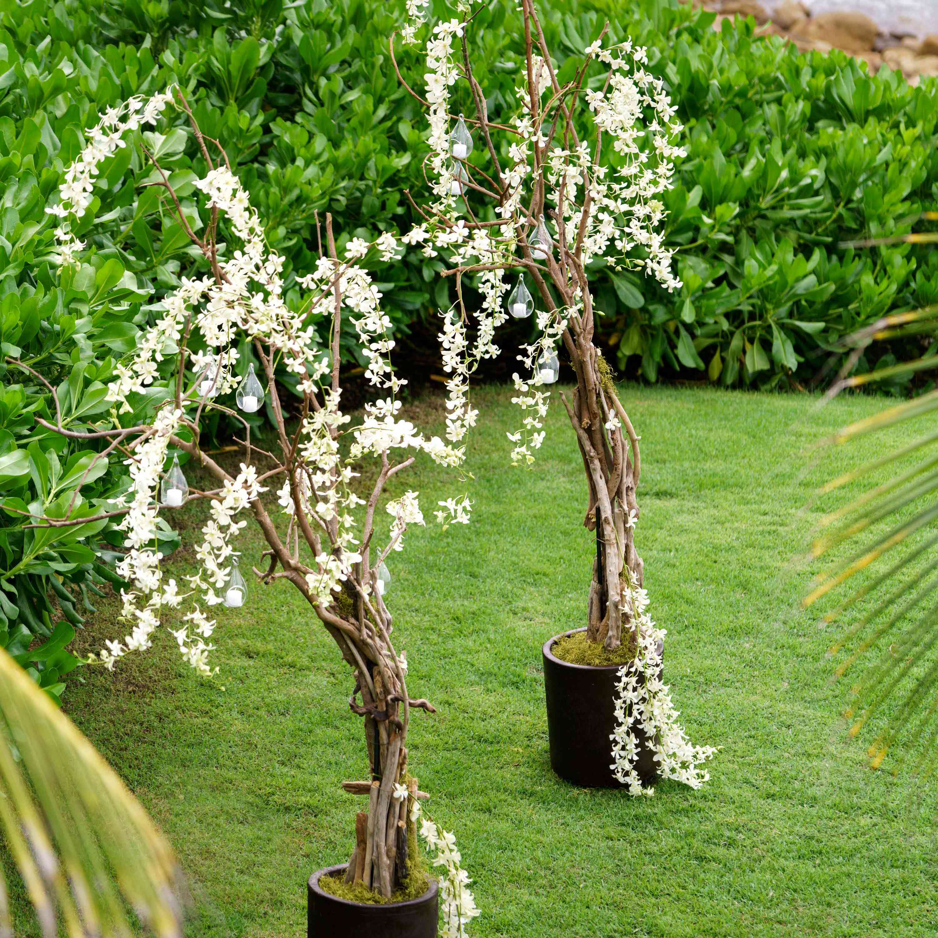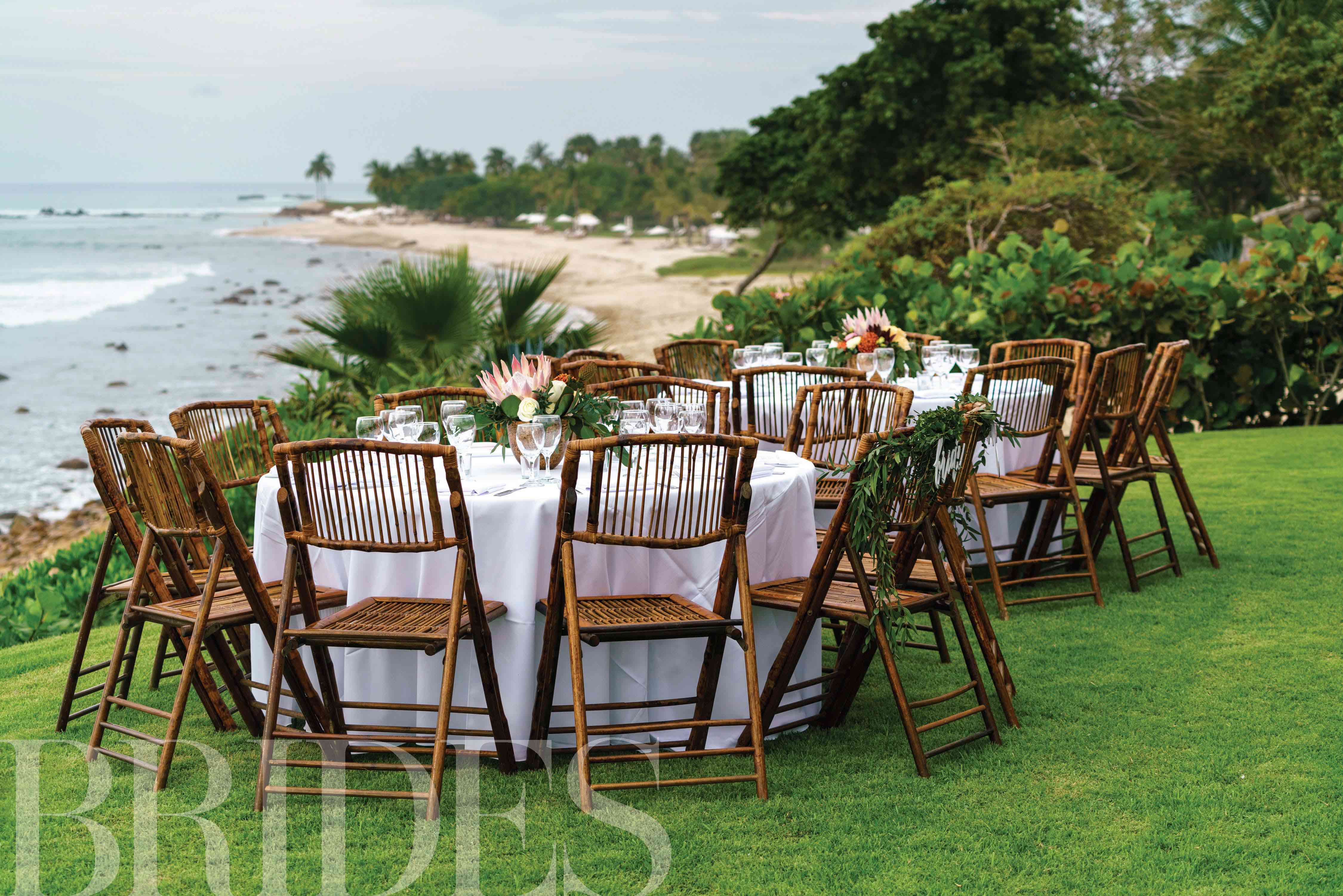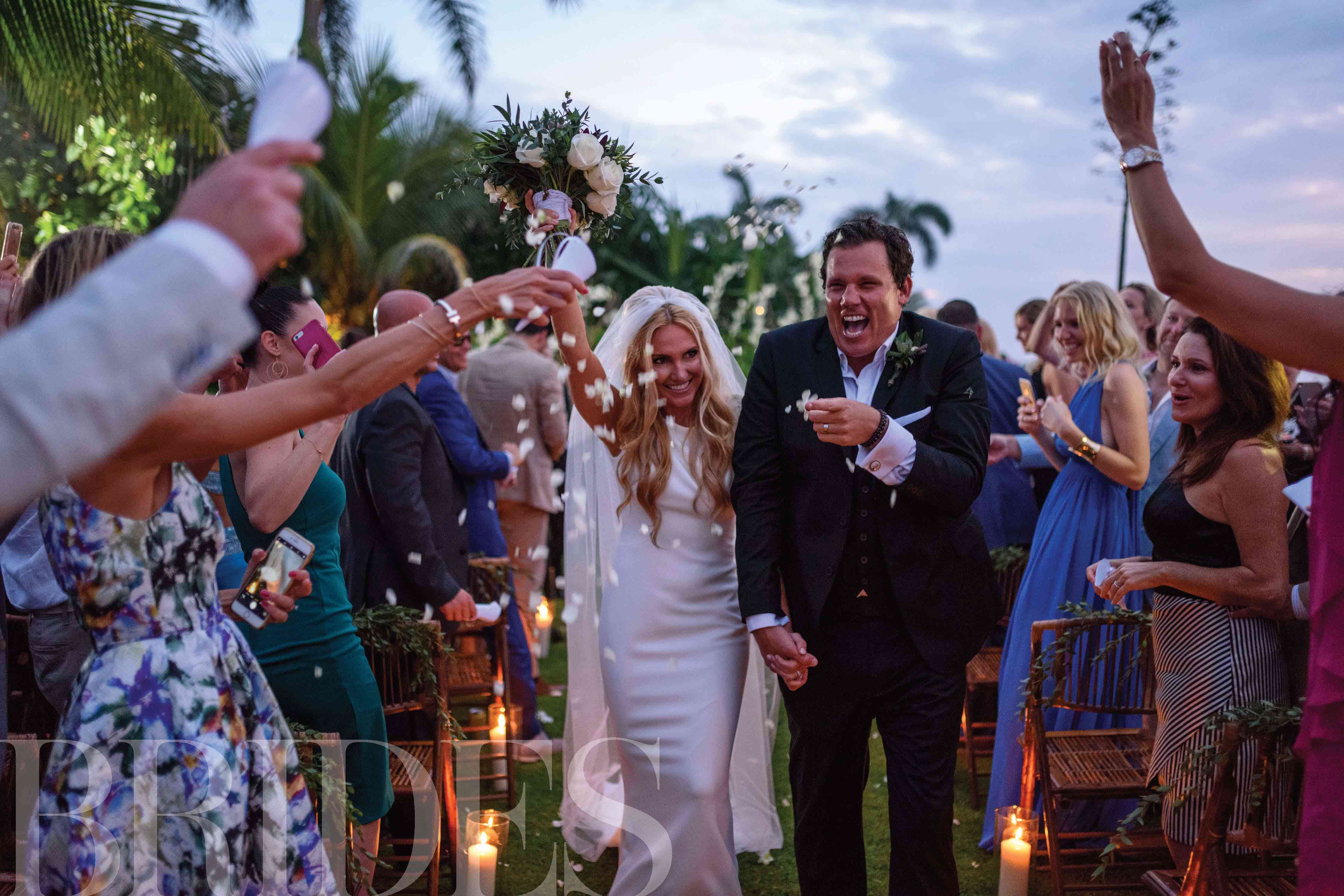 “我们依靠海洋提供了仪式的浪漫背景,”杰西卡说,但这并没有阻止这对夫妻在大量的鲜花和发光的蜡烛中取出空间。他们的仪式结构是由分支机构和当地白花制成的仪式结构,是鲍勃和杰西卡的誓言的令人惊叹的焦点。