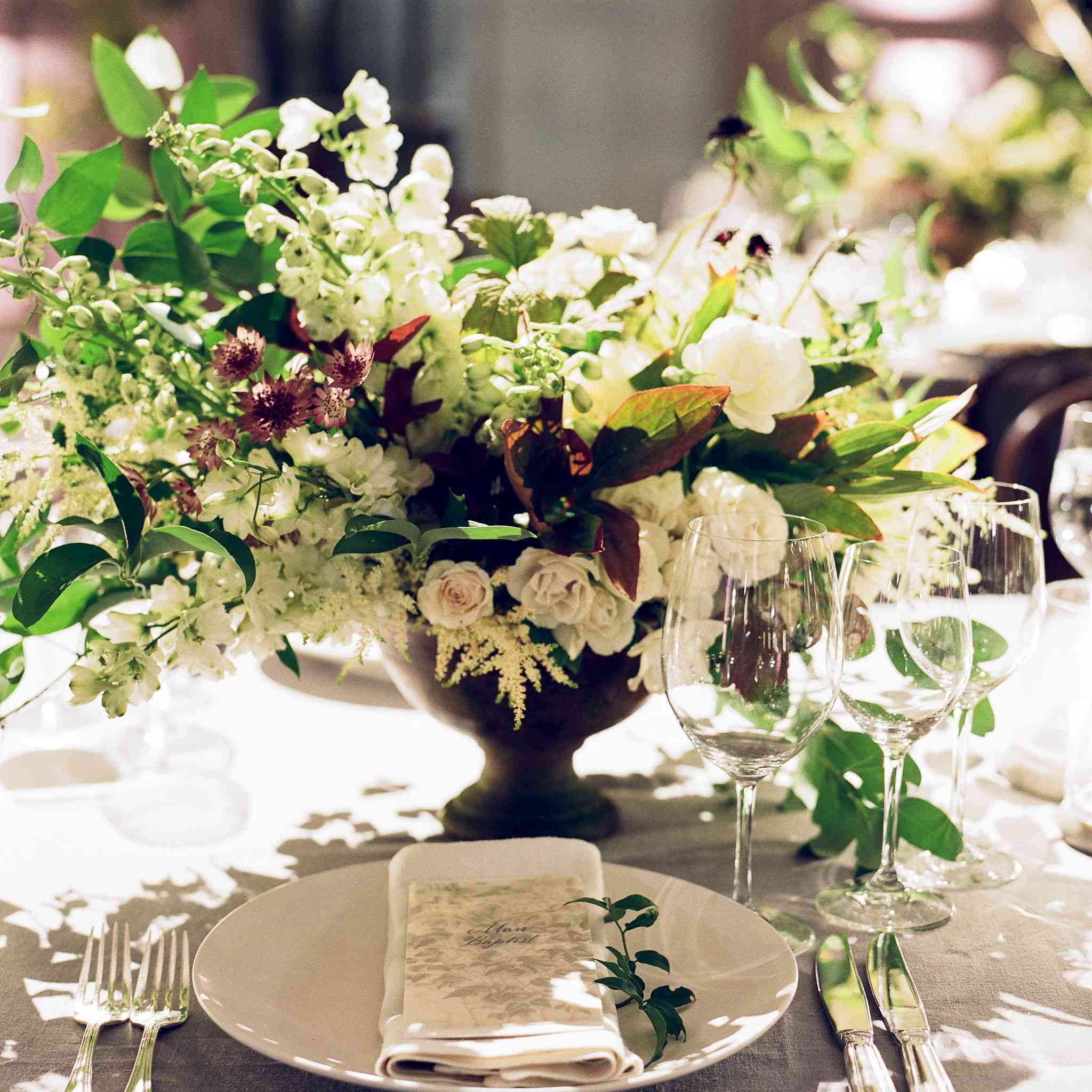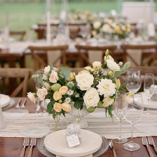 圆形和长桌子装饰着低瓮的宽松,自然的中心,在不同的白色和绿色的不同色调,完成了勃艮第的流行音乐。客人可以享受一顿两门课程的晚餐,并啜饮这对夫妇签名鸡尾酒蜜蜂的膝盖,这是一个杜松子酒和当地蜂蜜用新鲜的柠檬汁。