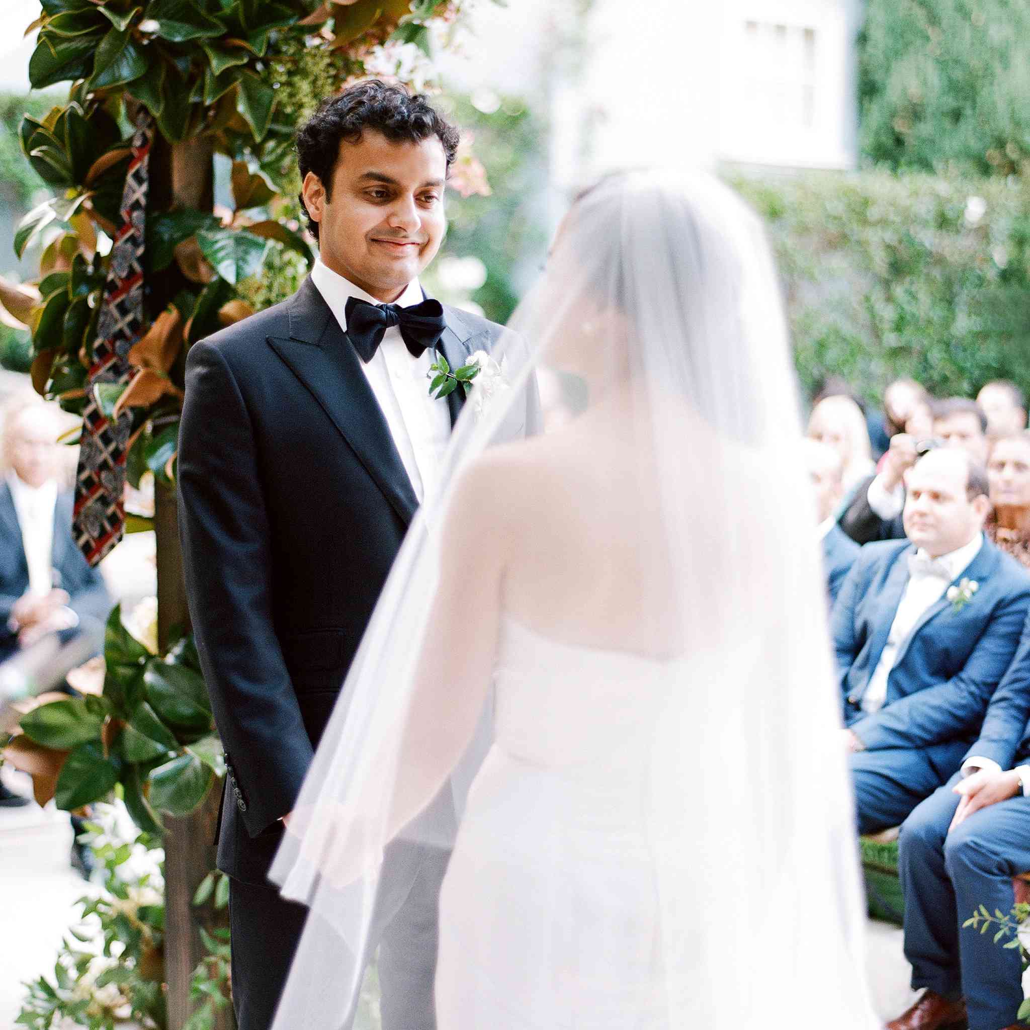 下午5点仪式是由牧师和拉比官员主持的,这是对这对夫妇重要的决定。“我们希望统一犹太人和天主教宗教的杂烩,”米歇尔说。除了背诵自己的誓言之外,新娘和新郎还要求四个朋友分享有意义的读物,并删除了他们的直系亲属,阅读了七个传统的犹太婚礼祝福。