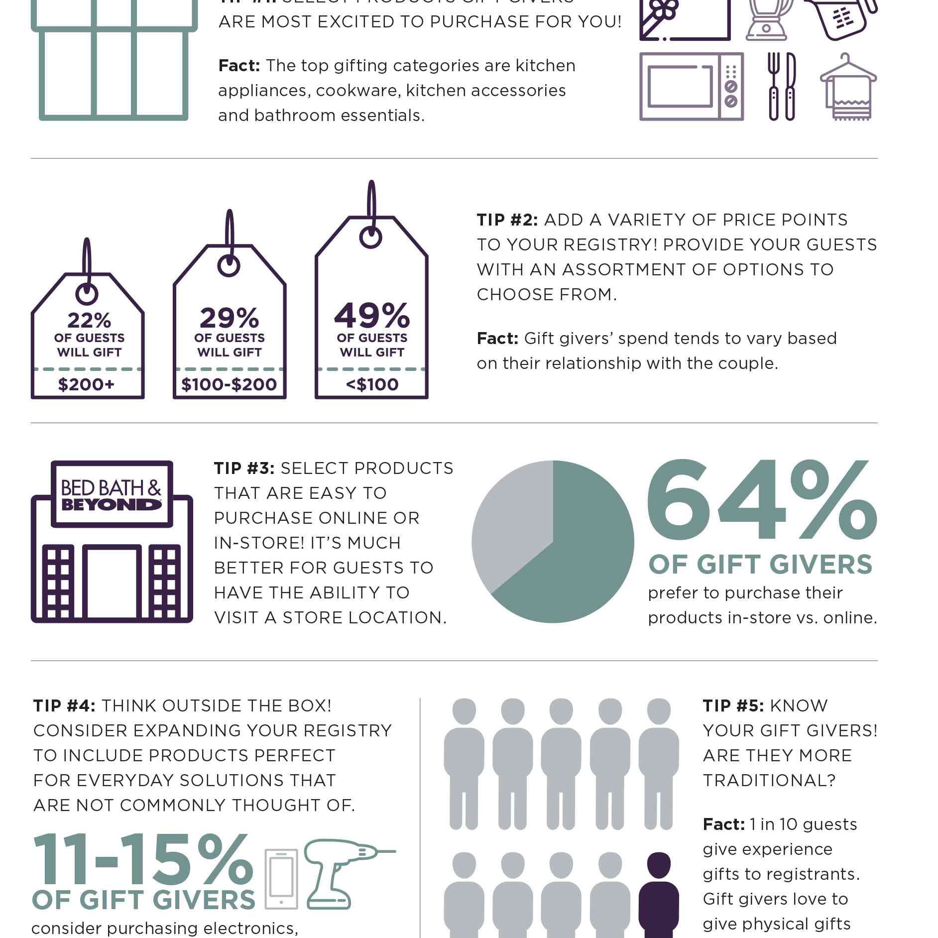当你仔细阅读并添加到你的注册表中的产品时,请确保你的所有价格点都符合每位客人的预算——特别是那些价格在100美元范围内的产品。当然,每位客人与这对夫妇的关系与他或她的身份有关愿意花令人惊讶的是,只有22%的送礼者愿意花200美元或更多从登记处购买结婚礼物。另一方面,49%的客人会买100美元或更少的礼物,29%的客人会花在这两者之间。