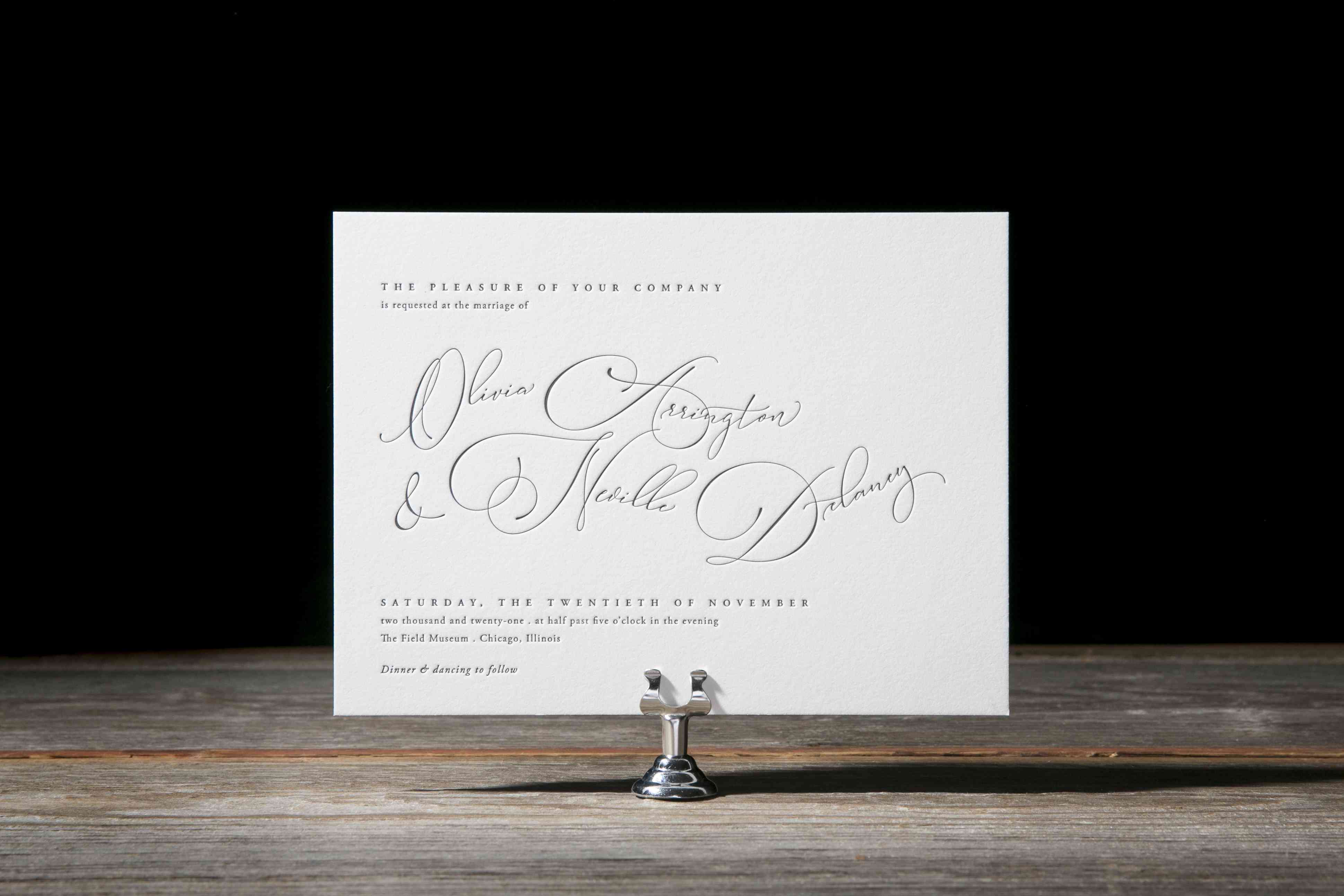 它不会比经典更永恒黑色和白色细节。再加上,与之形成鲜明对比增加了额外的突出的元素,您的邀请。金箔分散在整个这个文具套装点缀增添了现代的感觉,而不从整体经典氛围减损。