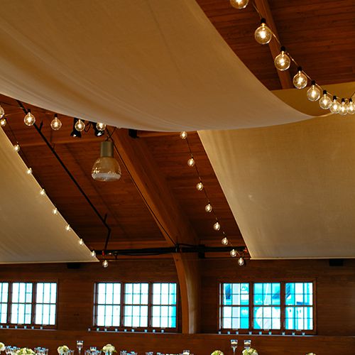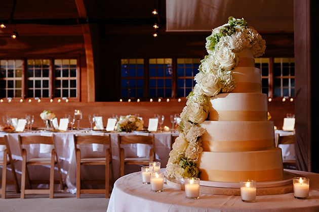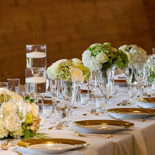 招待会在谷仓里举行,舞池旁边有两张长桌子,另一头有两张短桌子。轻亚麻布上点缀着绣球花和白玫瑰,并配以金色的器皿和餐具,营造出一种迷人的感觉。