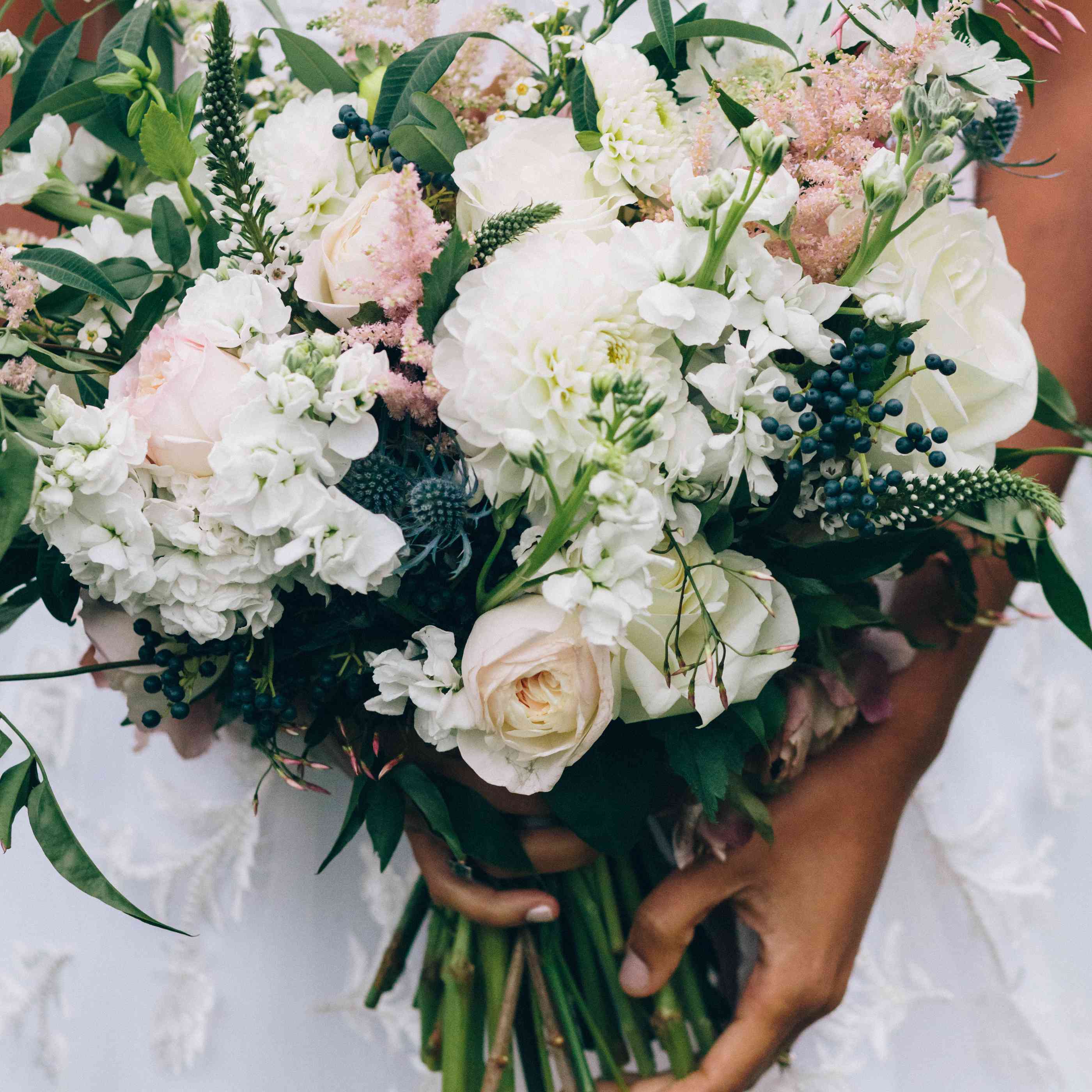 由大丽花、玫瑰、落葵、蓟和浆果组成的浪漫花束是爱花的新娘梦寐以求的安排。