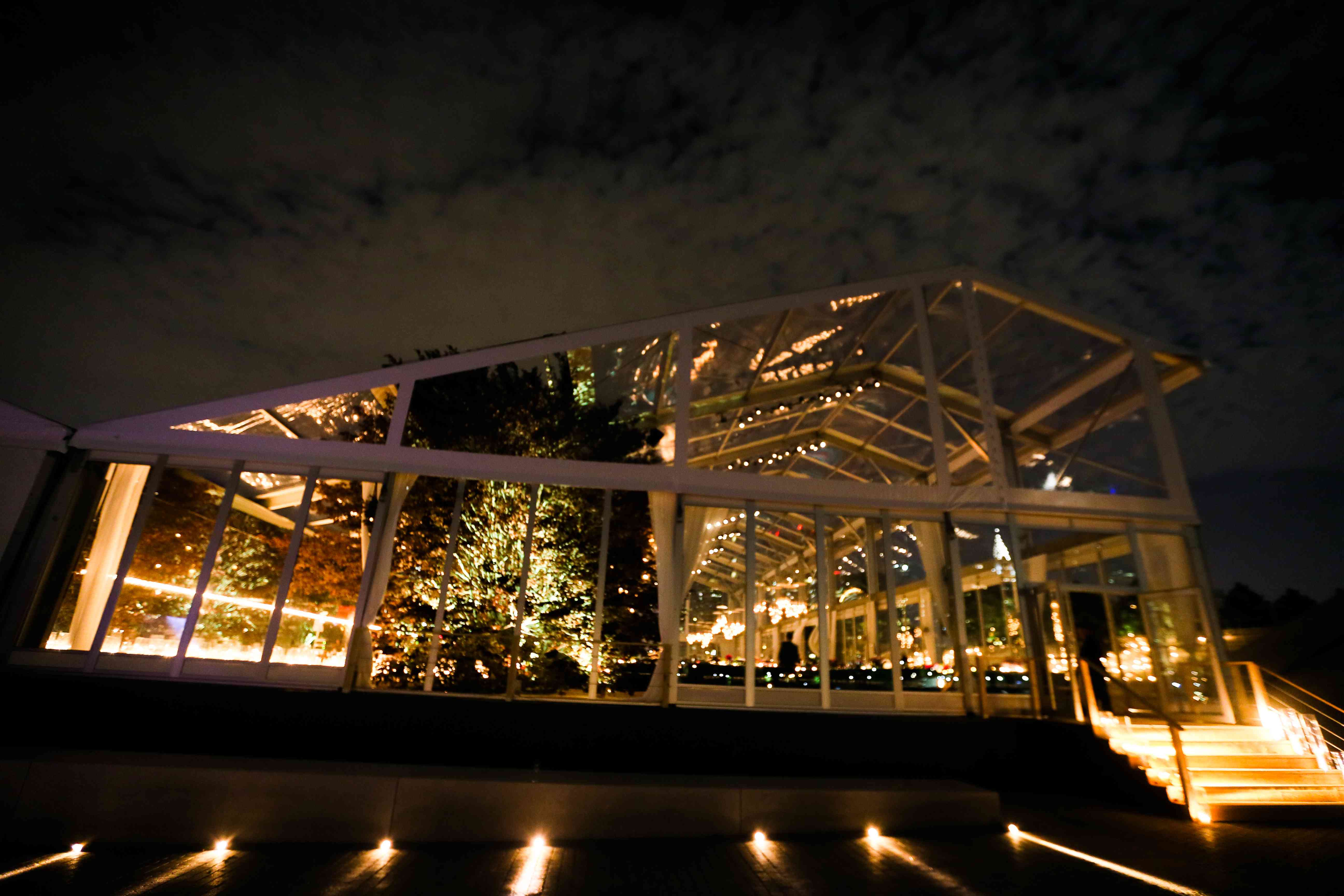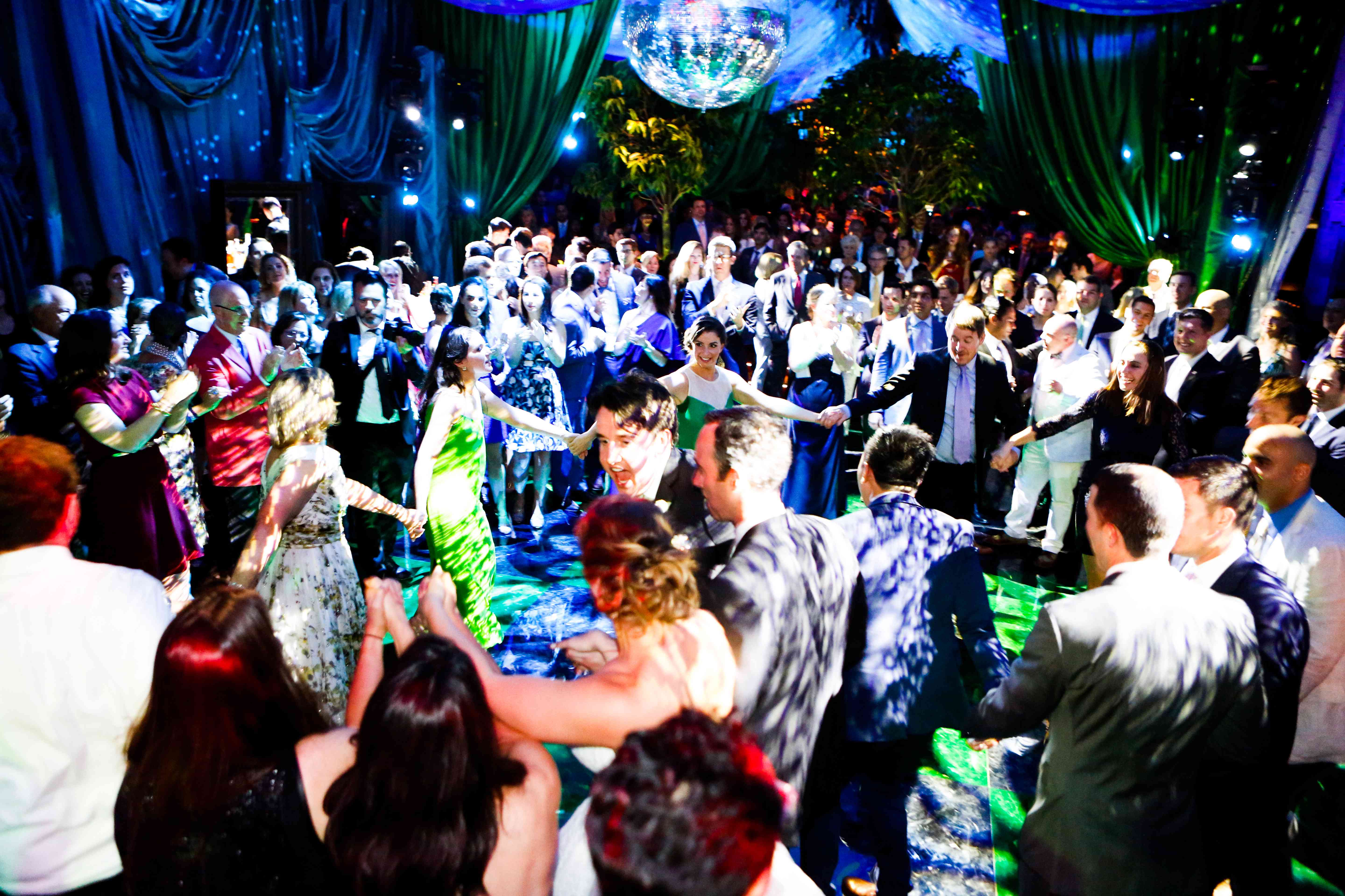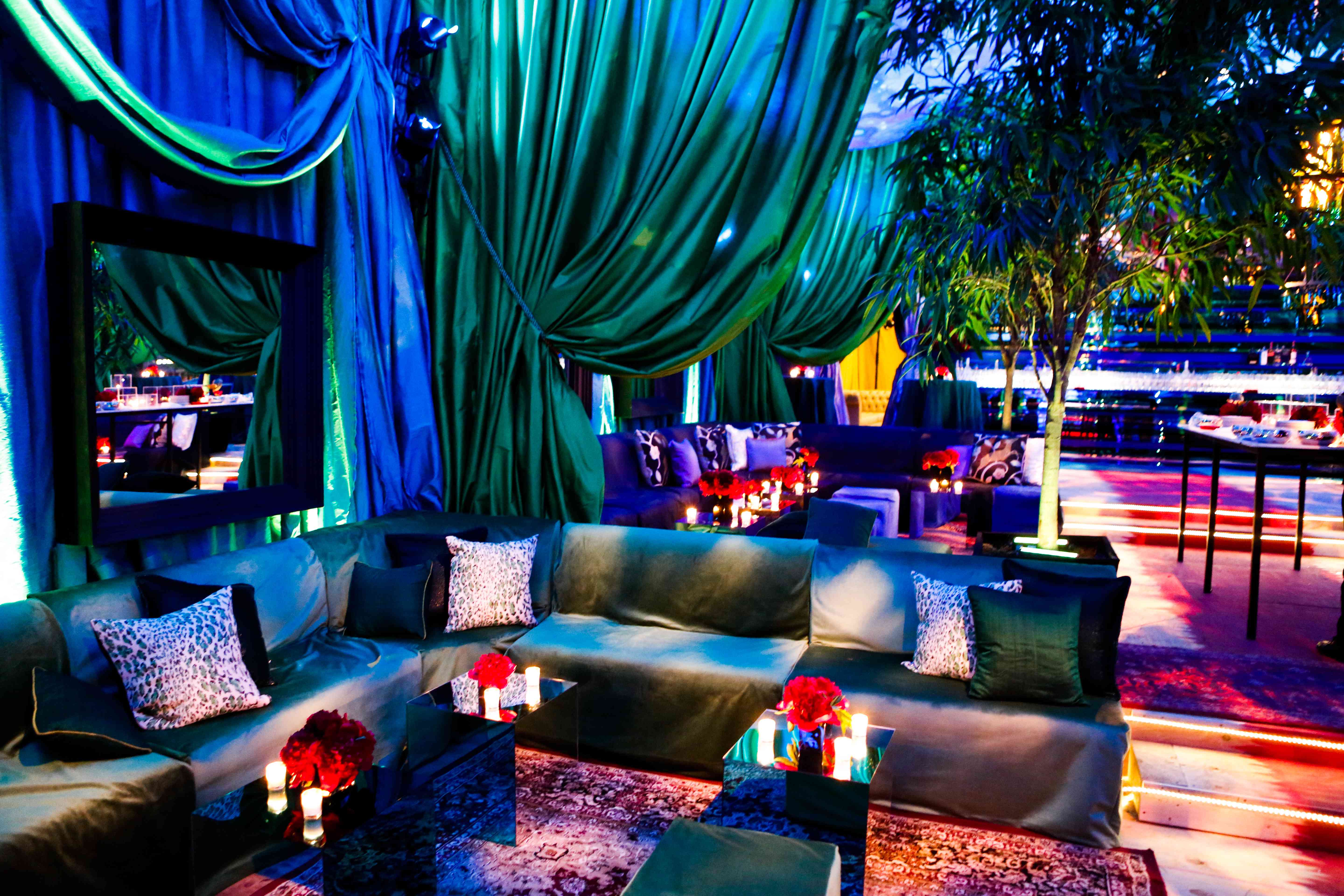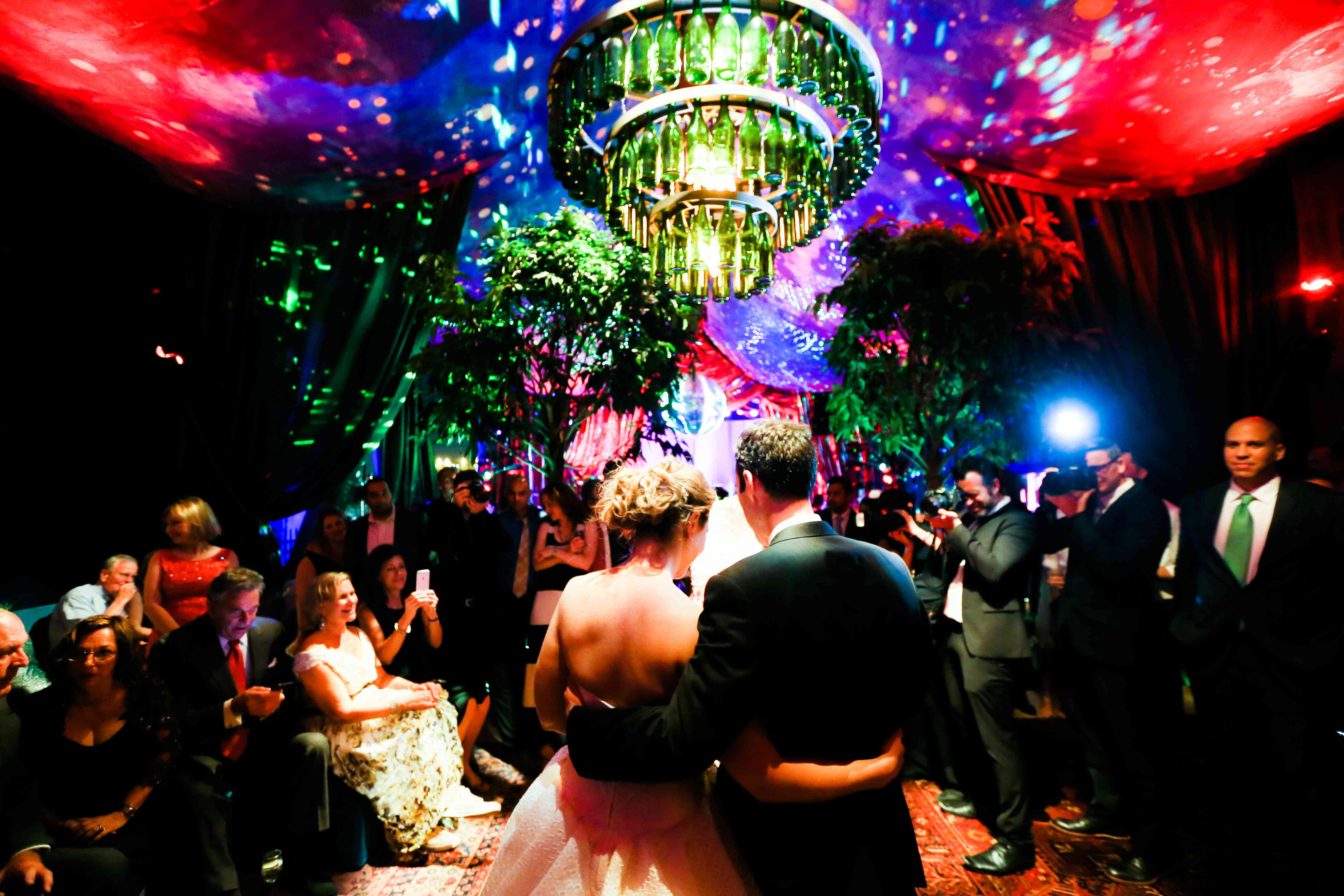 说到晚餐后的帐篷,新娘说得最好。“这与餐厅截然不同,”她谈到第二个庆祝空间时说。“是舞会的时间了!”为了让第二个空间有一种夜总会的感觉,Van Wyck的团队在帐篷内悬挂了厚厚的彩色织物,然后用发光涂料在这些织物上涂上不同的图案。整个晚上,灯光的变化揭示了隐藏的惊喜,就像黑暗的壁画和发光的迪斯科球。第二个帐篷有一个超时髦的照明选择:完全由酒瓶做成的吊灯!