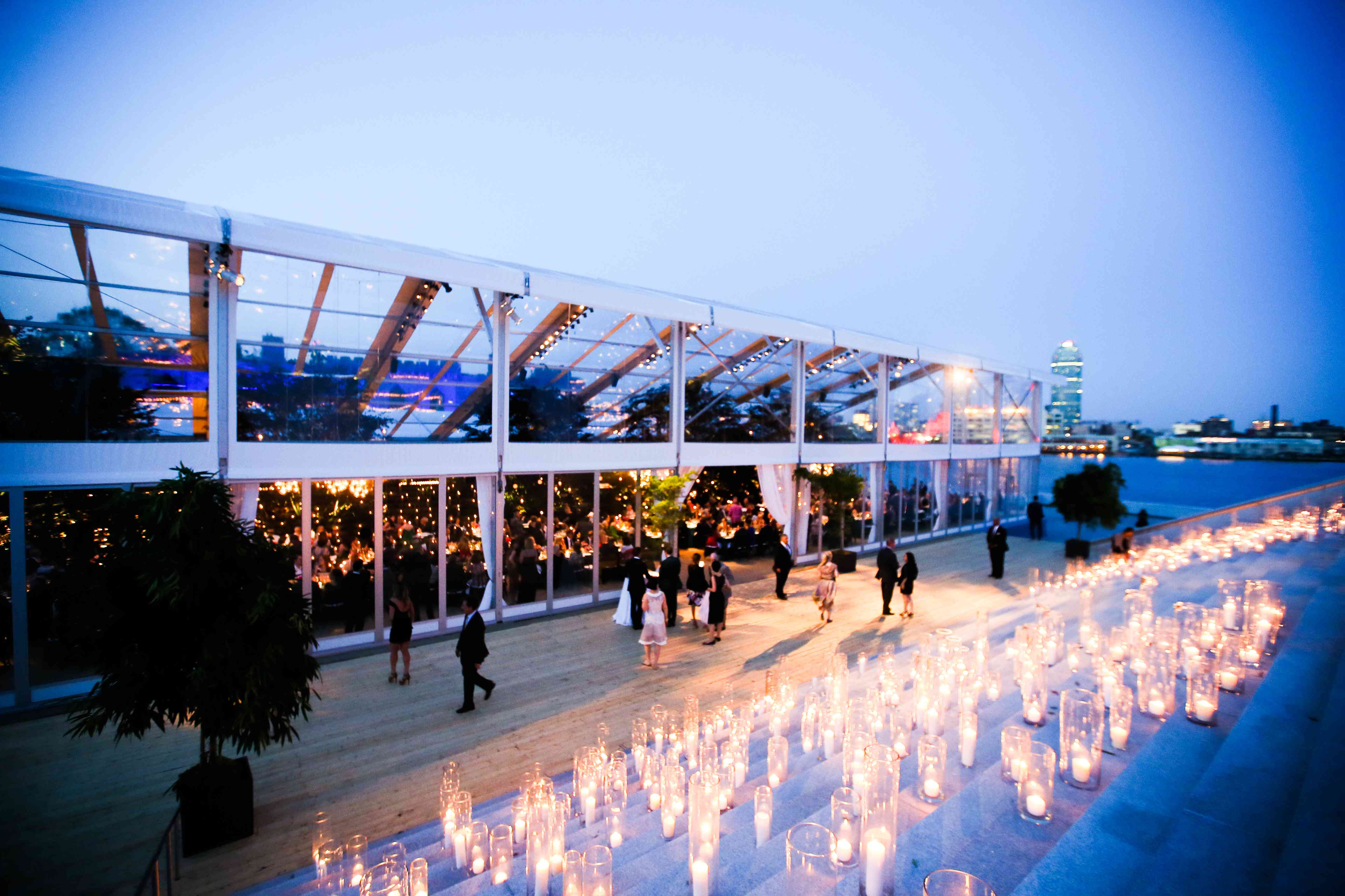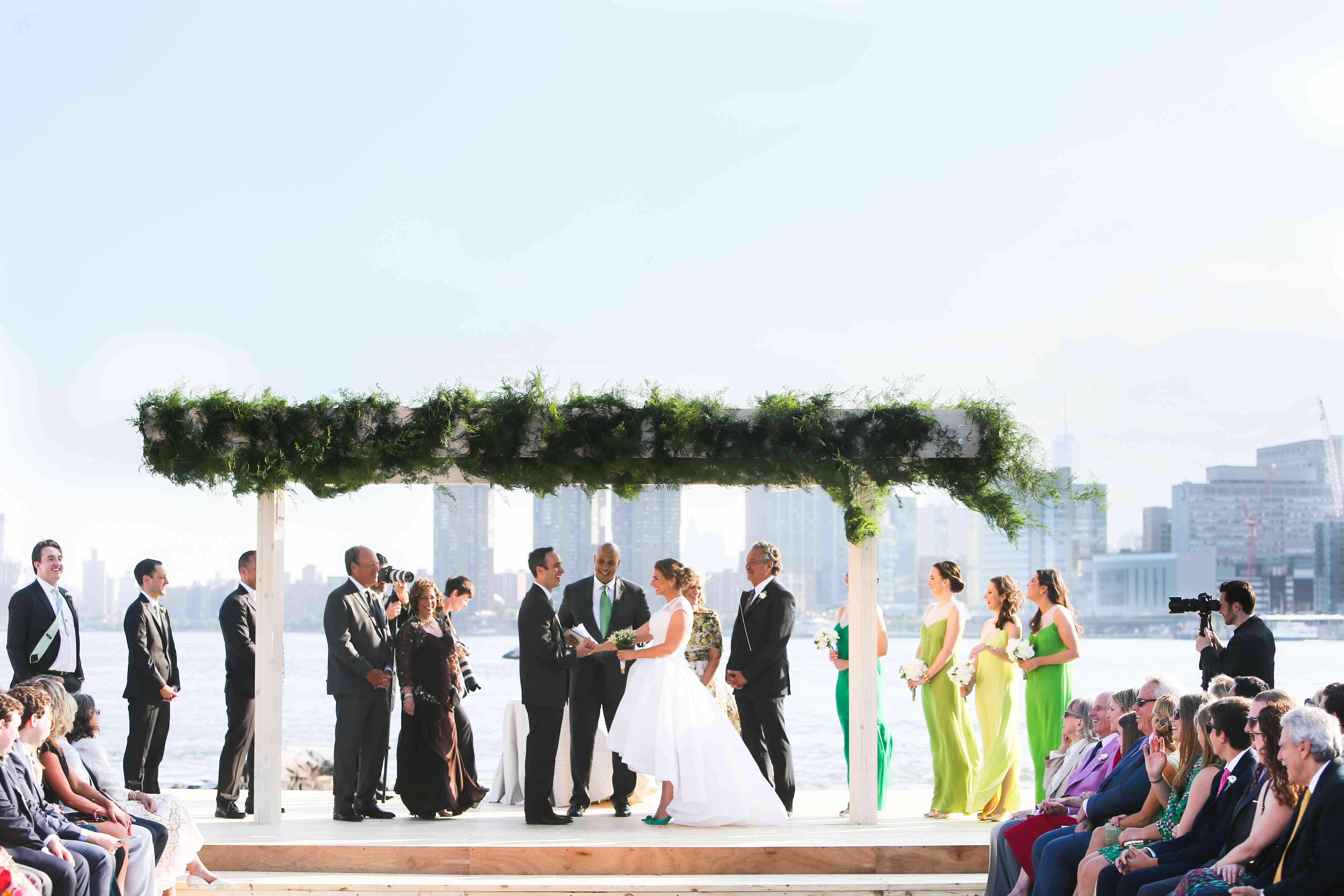 随着城市景观提供终极背景,新娘和新郎知道他们的装饰应该只加强公园现有的宏伟。在罗斯福岛上建造的白色chuppah被蕨类植物裹着,客人在这两个完美的树木之间坐在两棵完美的树之间看了两次交易所。随着音乐家从百老汇音乐剧上演奏“爱情的季节”,艾米丽和她的父亲走了下来租金。