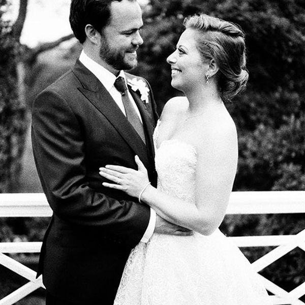 “我想要一件简单的直筒礼服,但是当我穿着它旋转的时候,我就爱上它了,”艾丽说到她的传奇人物罗蒙娜·凯夫扎的婚纱。合身的丝绸紧身胸衣有一个船领,向后凸,并让位于丝绸欧根纱长裙。她把衬里绣上了她的新字母,还戴了一个钻石珍珠手镯,那是乔希祖母的。