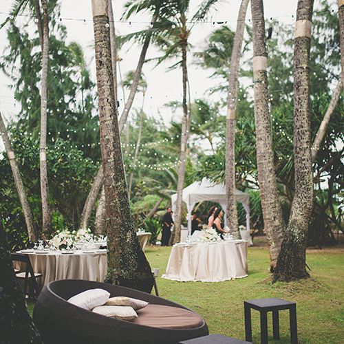 在一位密友的主持下交换了誓言后,珍妮特和亚伦和客人们一起坐在海边的草坪上,吃了一顿经典的夏威夷餐,有卡卢阿猪和Spam musubi,然后开始跳舞,直到最后都挤满了人。