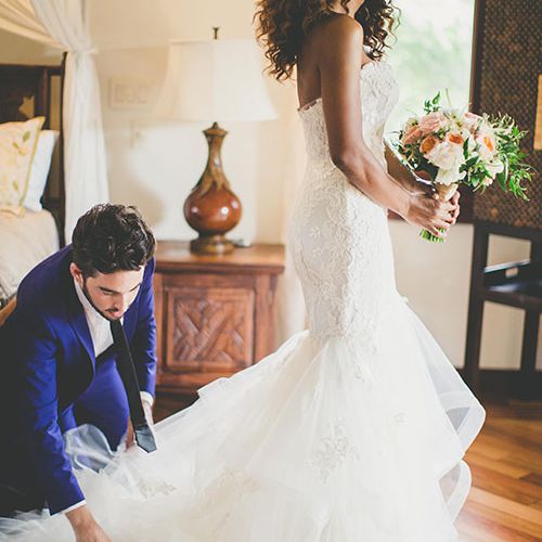 珍妮特浏览了Pinterest网站,看了很多婚礼杂志,还向朋友们请教如何分清事情的轻重缓急。当这对夫妇开始思考他们的一天时,他们的愿景一致了:他们都想在珍妮特的家乡附近举行一次亲密的、充满乐趣的聚会夏威夷.7个月后,76名宾客加入了他们于2015年11月5日在瓦胡岛莱伊(Laie)俯瞰太平洋的私人庄园黑尔寇阿(Hale Koa)举行的婚礼。通过阅读来偷窥他们的一天毛伊岛让摄影,独家分享于2016年4月/ 5月的《新娘》杂志,现已发售!