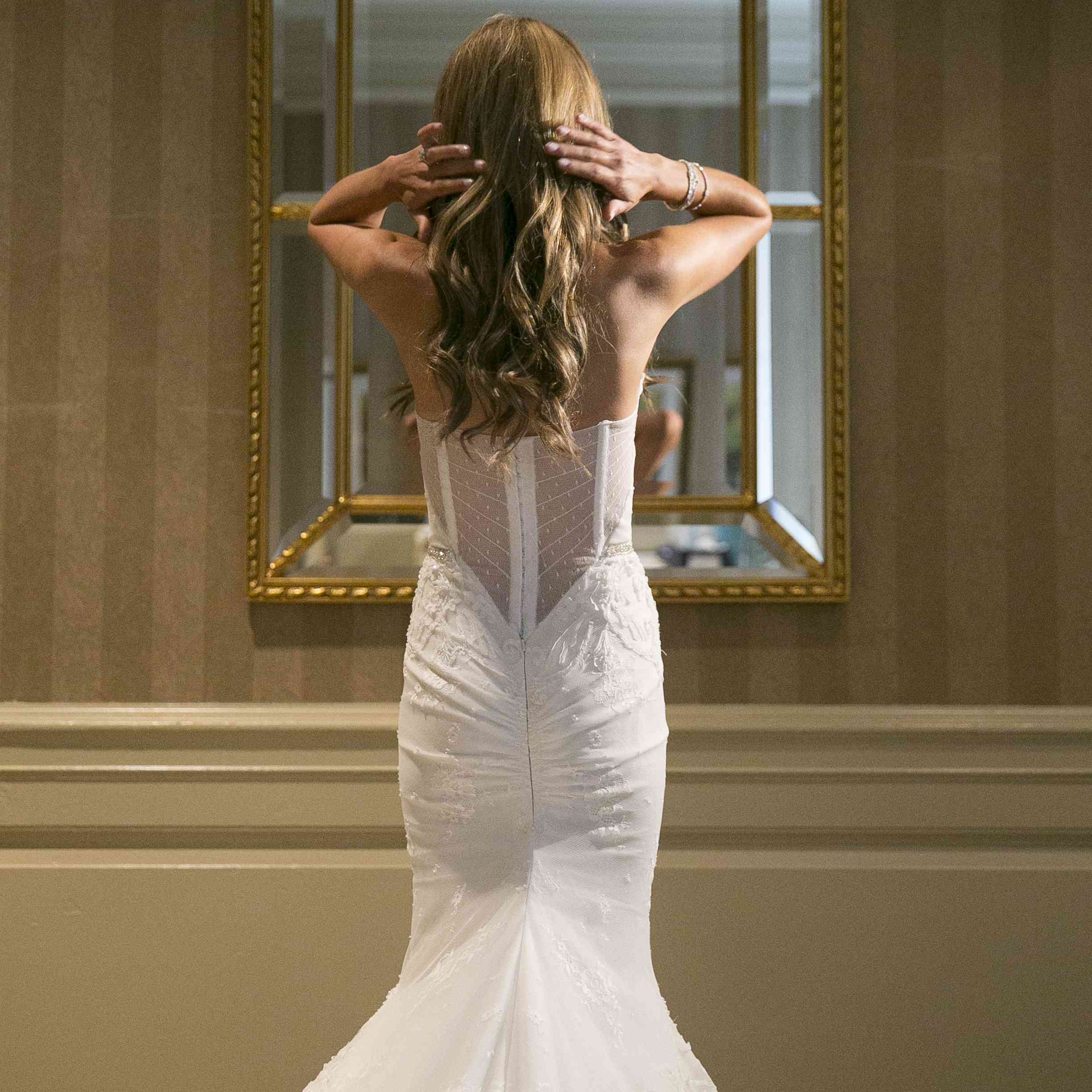 尽管她花了近三个月购买礼服在全城,Marni回到第一个看起来她试过:一个象牙美人鱼婚纱绝对和串珠花边Inbal Dror。“我知道我想要一个礼服向世界和惊人的细节,这是它,”她说。“我试过在一个树干上节目,最后几乎飞往佛罗里达找到样本和试穿一次!”Thankfully, a local salon was able to get the dress for her and she placed her order with just six months to spare.