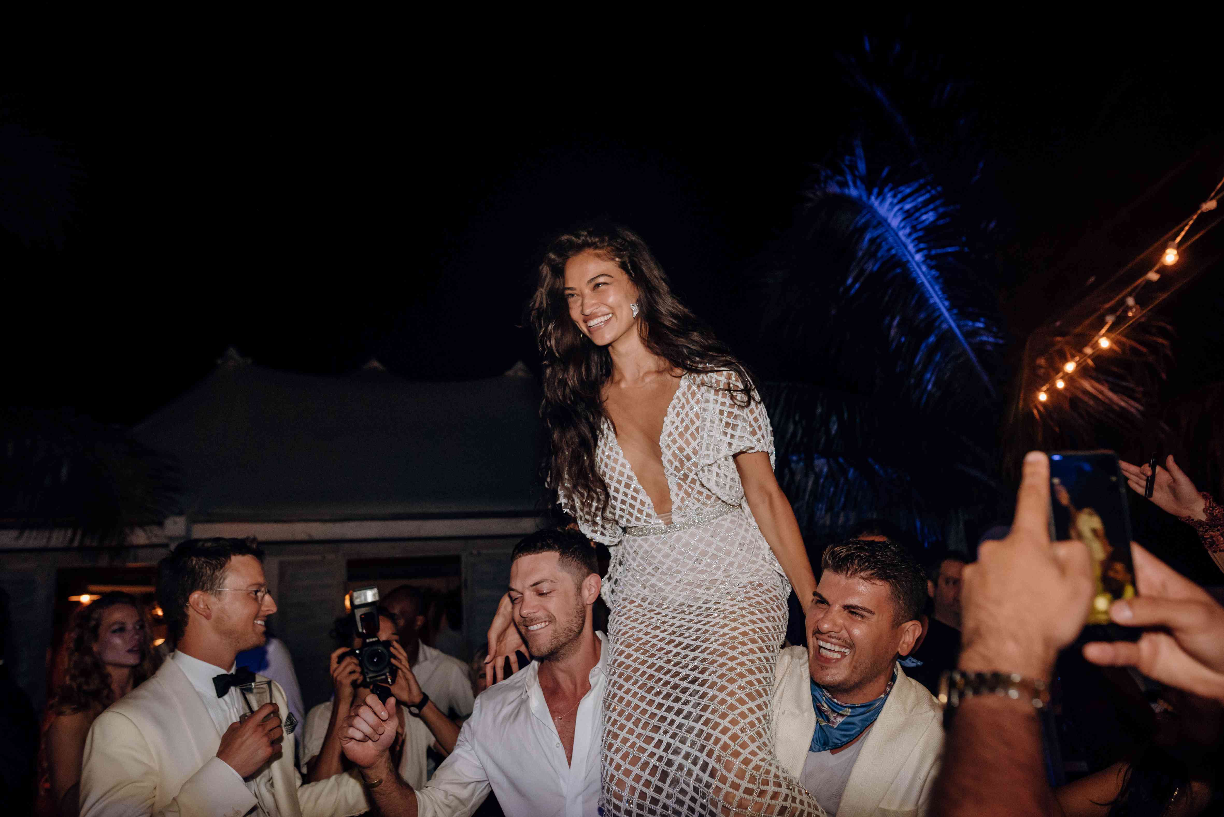 这对夫妻邀请他们的朋友和家人一个周末的价值庆祝活动。该事件在周五晚上俯瞰着海滩的露台上晚宴彩排。Shanina穿着的场合长袖白色连衣裙和楔子由齐默尔曼。新郎穿着一件鲜艳的衬衫搭配党的花卉安排。