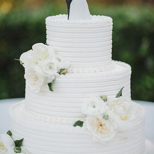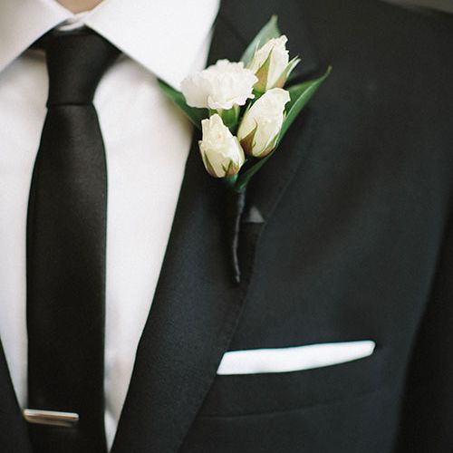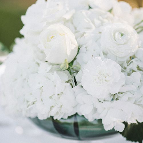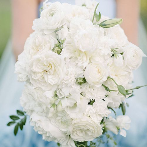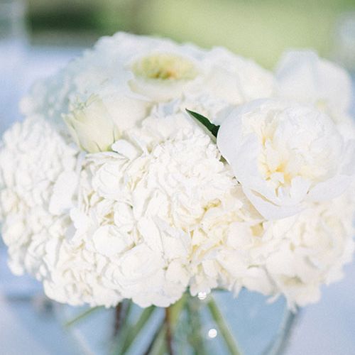 Brittney的华丽白人的花束特色康乃馨,牡丹,花园玫瑰,和绿叶。“康乃馨是我最喜欢的花,所以这是显而易见的,”她说。“其他的花看起来很协调。”She initially wanted a cascading bouquet, but with the movement of her full skirt, sticking to a classic round bouquet let both the dress and the flowers shine rather than compete.